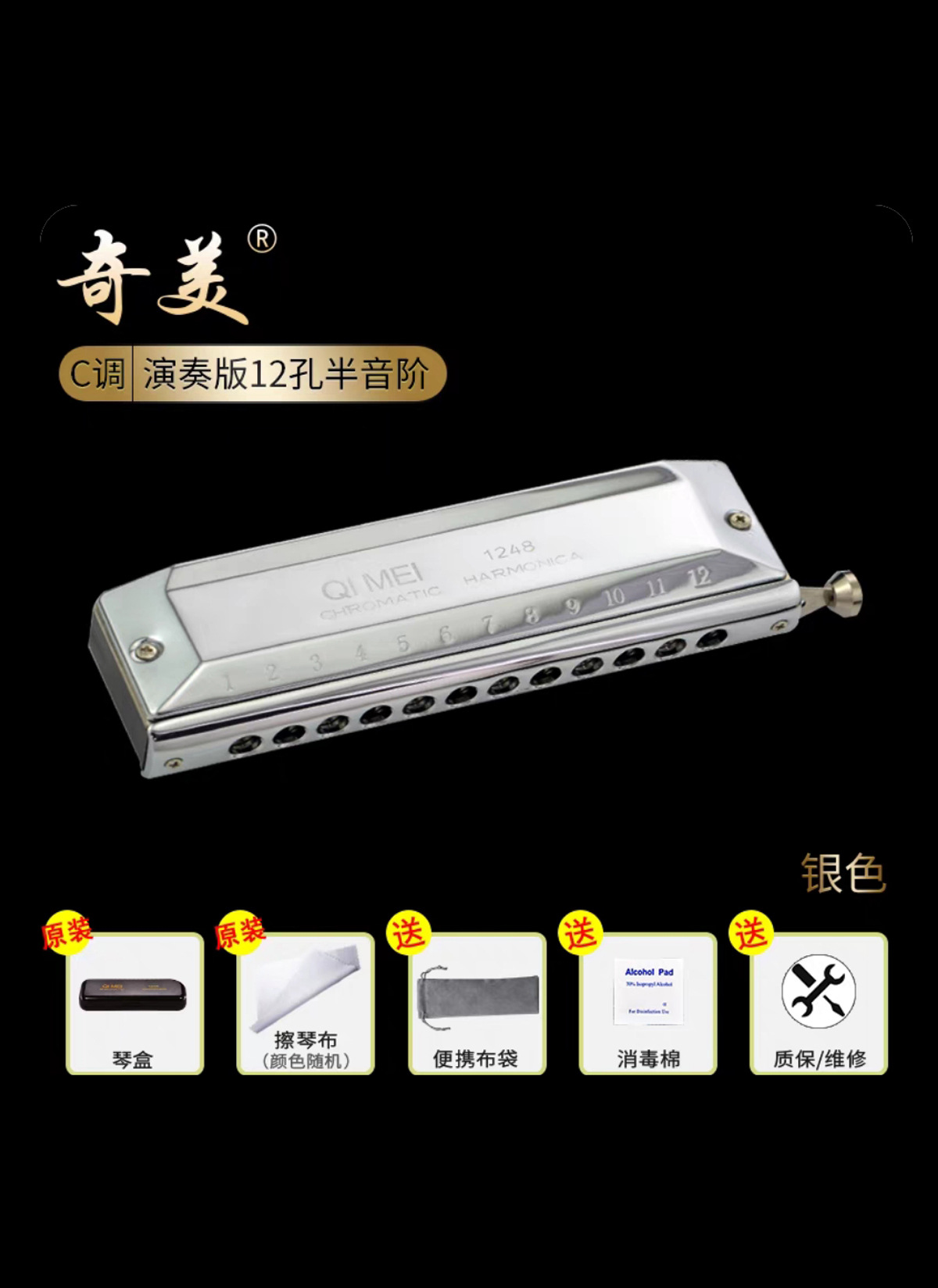 奇美12孔圆吹口半音阶口琴(银色)+布袋
