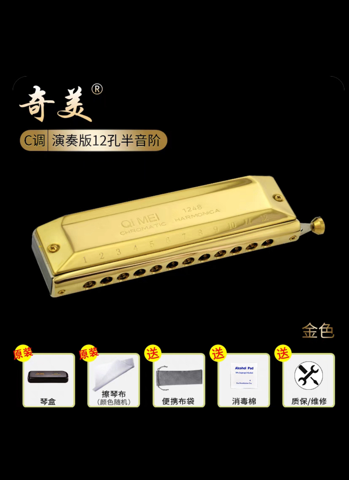 奇美12孔圆吹口半音阶口琴(金色)+布袋