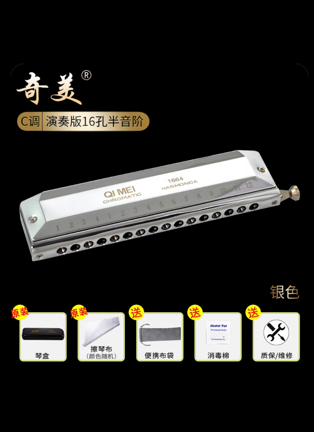 奇美10孔方吹口半音阶口琴(银色)+布袋
