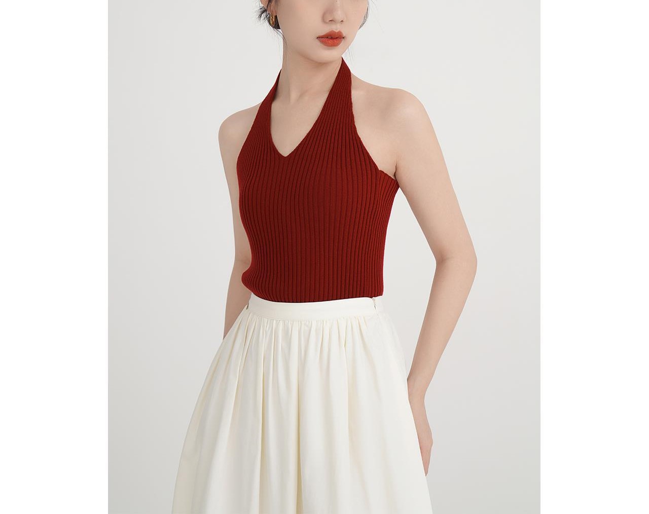 法式复古红色无袖挂脖针织背心女夏季新款性感露背短款上衣