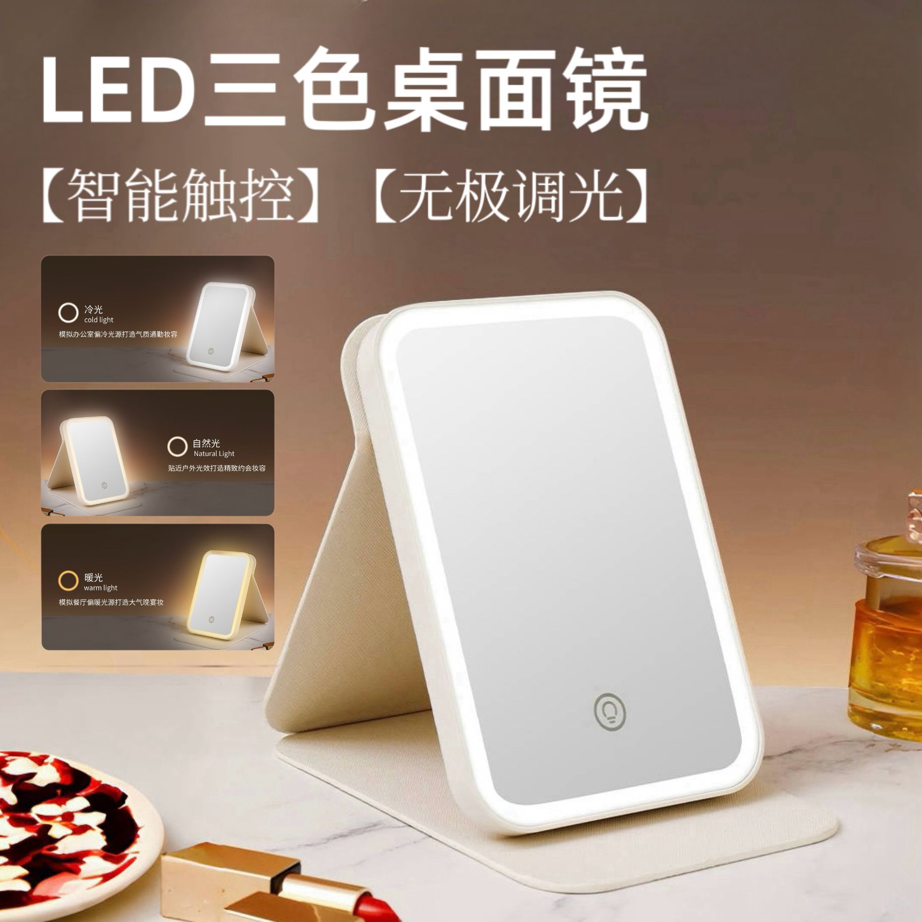 LED化妆镜带灯台式梳妆镜女生补光桌面梳妆镜折叠网红宿舍美妆镜