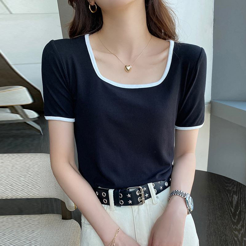 甄选高弹螺纹棉方领短袖t恤女夏季新款正肩百搭打底外穿上衣