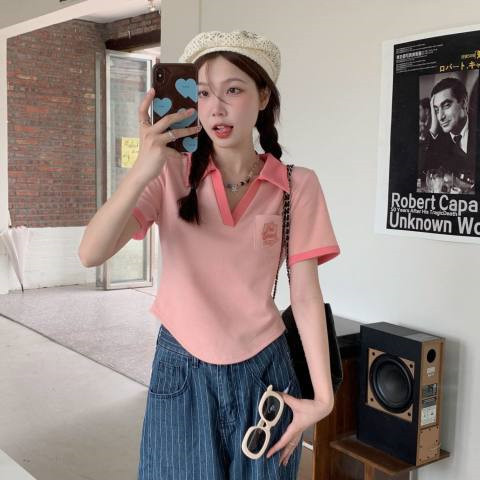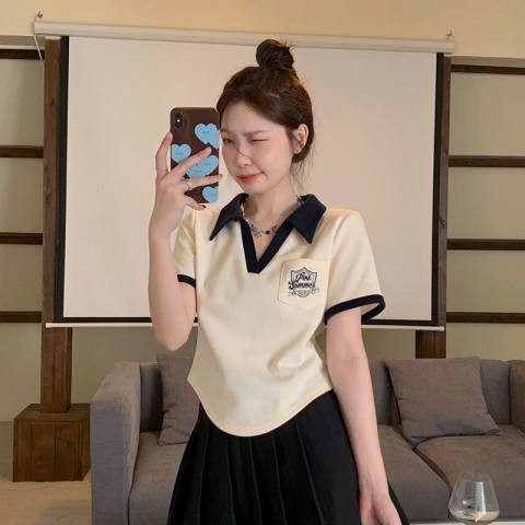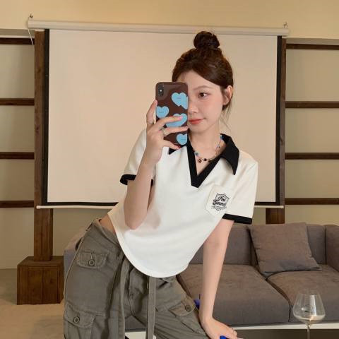 美式复古正肩polo衫撞色短袖t恤女夏宽松设计感小众别致短款上衣