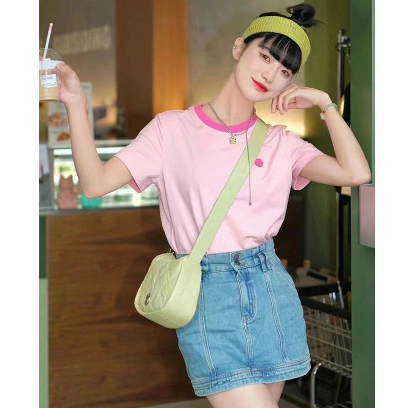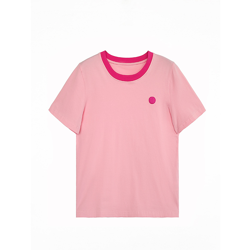 夏季新款优质棉凉感T恤女粉色正肩显瘦设计感短袖休闲上衣