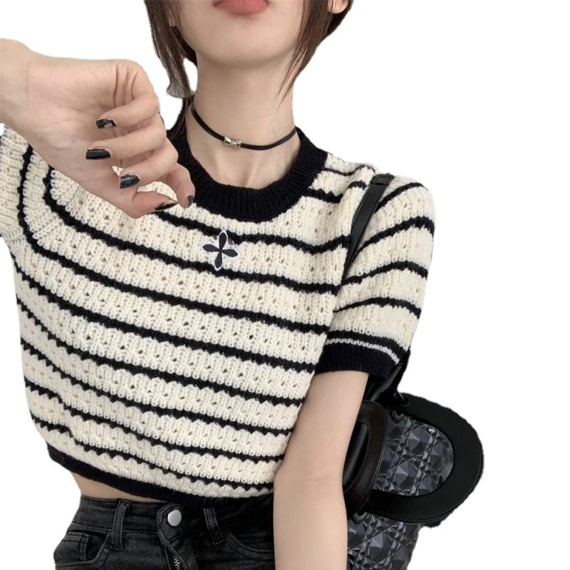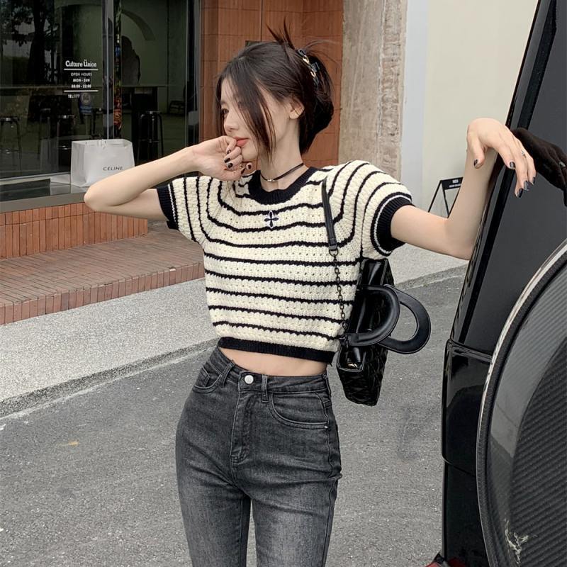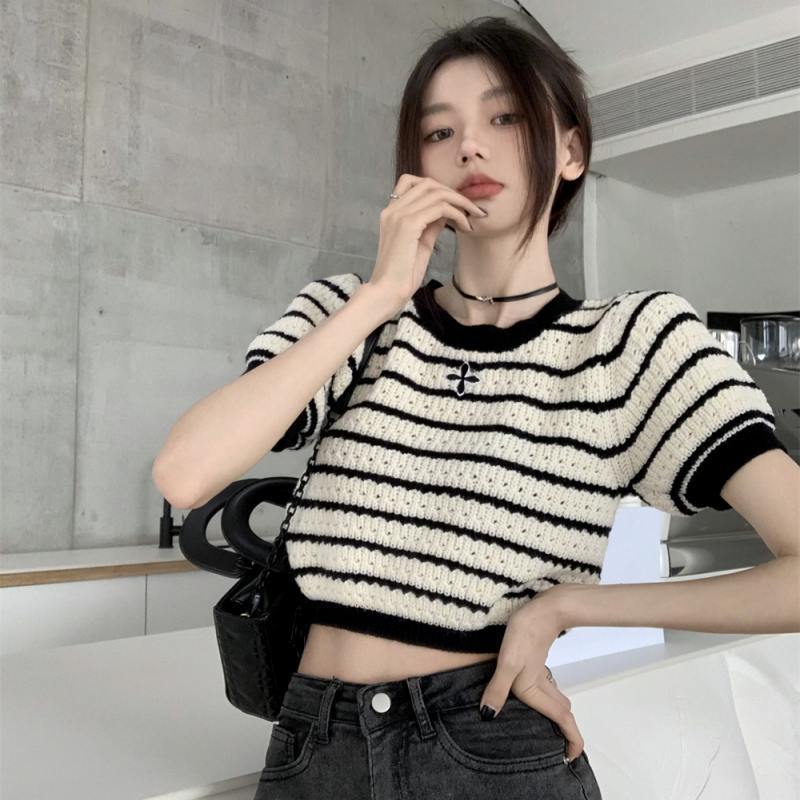 美式正肩条纹上衣针织泡泡短袖t恤女学院风小众夏季纯欲辣妹短款