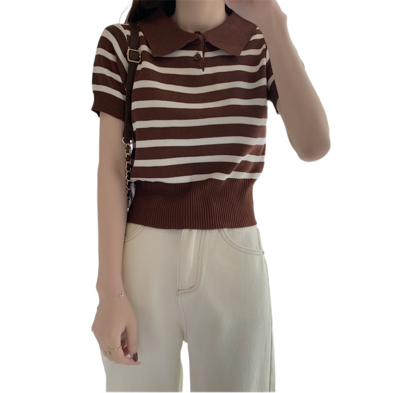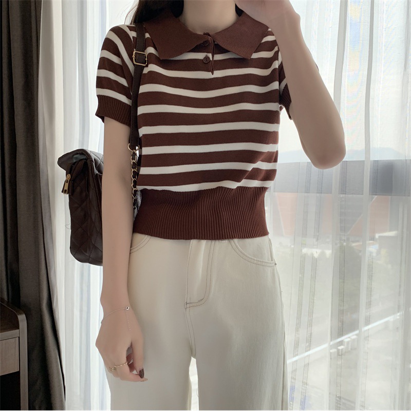 短袖T恤女设计感夏季韩系chic港味别致正肩修身条纹针织上衣ins潮