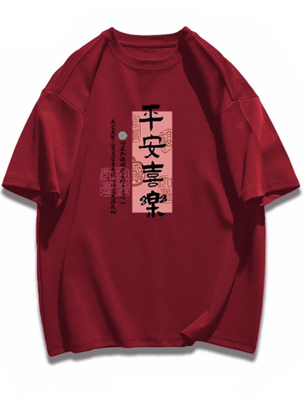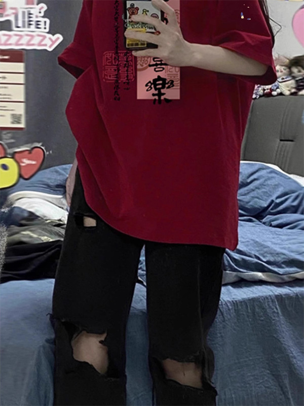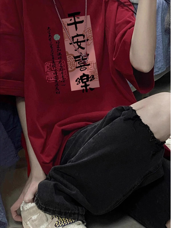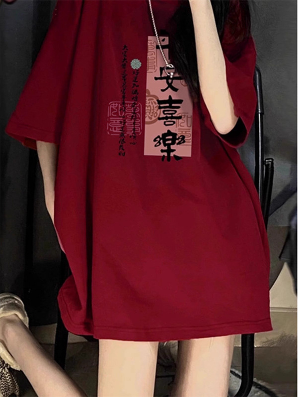 酒红色新年国潮牌纯棉重磅正肩短袖t恤女年春夏新款宽松上衣