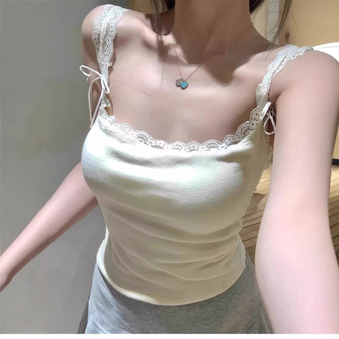 德绒花边吊带背心女保暖秋冬新款蕾丝拼接德绒遮副乳内搭打底上衣
