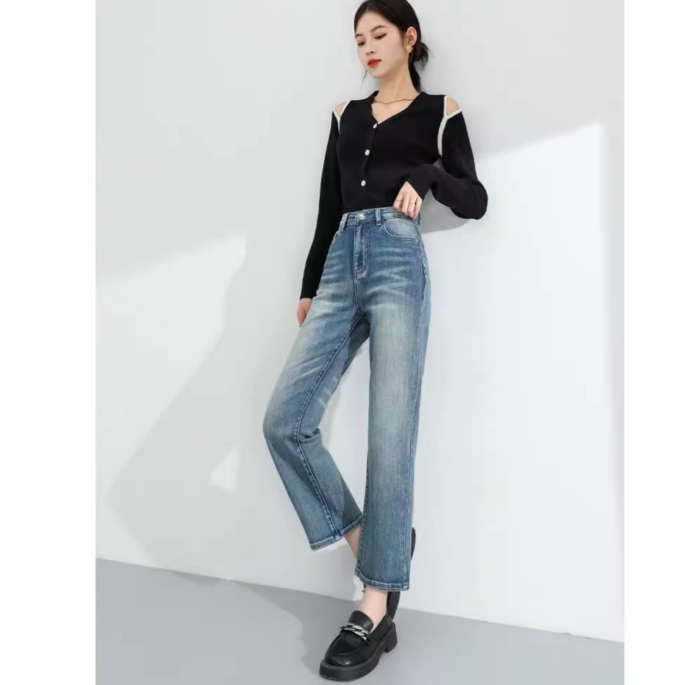 小个子直筒烟管裤春季新款高腰修身显瘦法棍裤女士牛仔裤