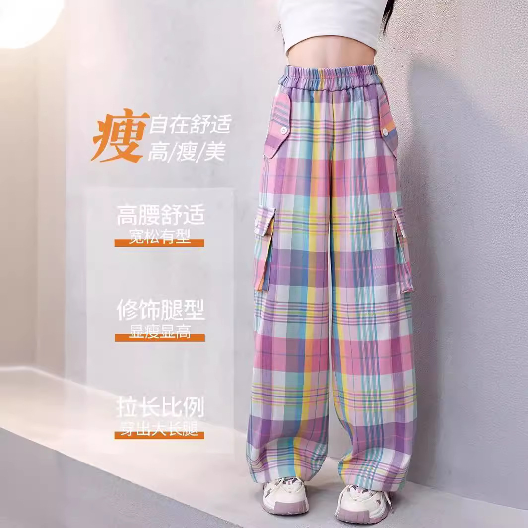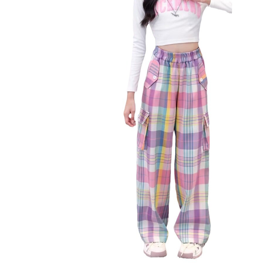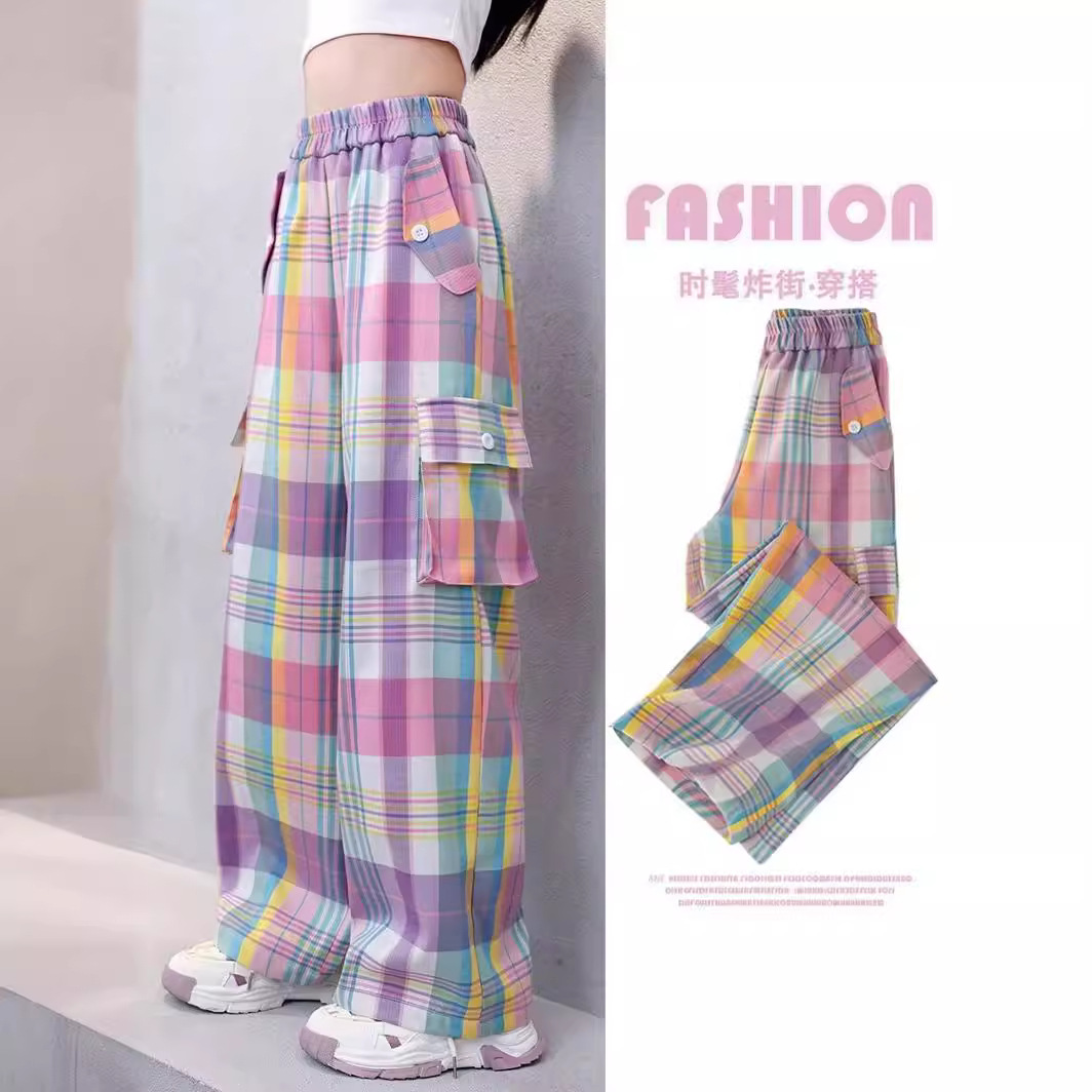 多巴胺童装工装裤春夏季彩色格子潮酷直筒休闲裤女童运动裤潮