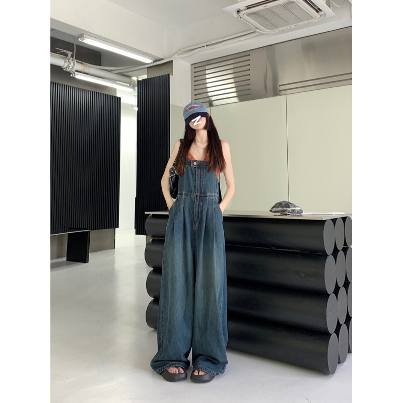适美复古蓝色水洗做旧背带牛仔裤女春夏宽松阔腿裤拖地裤长裤