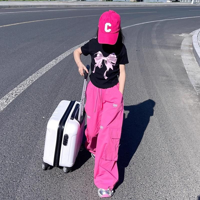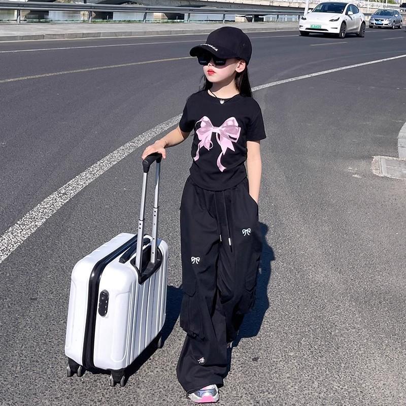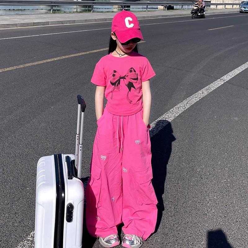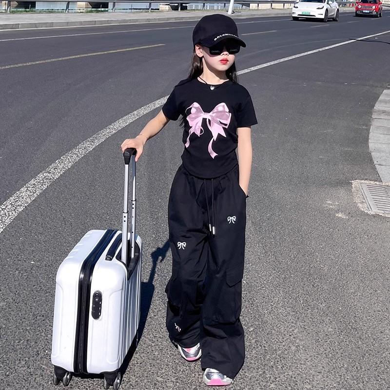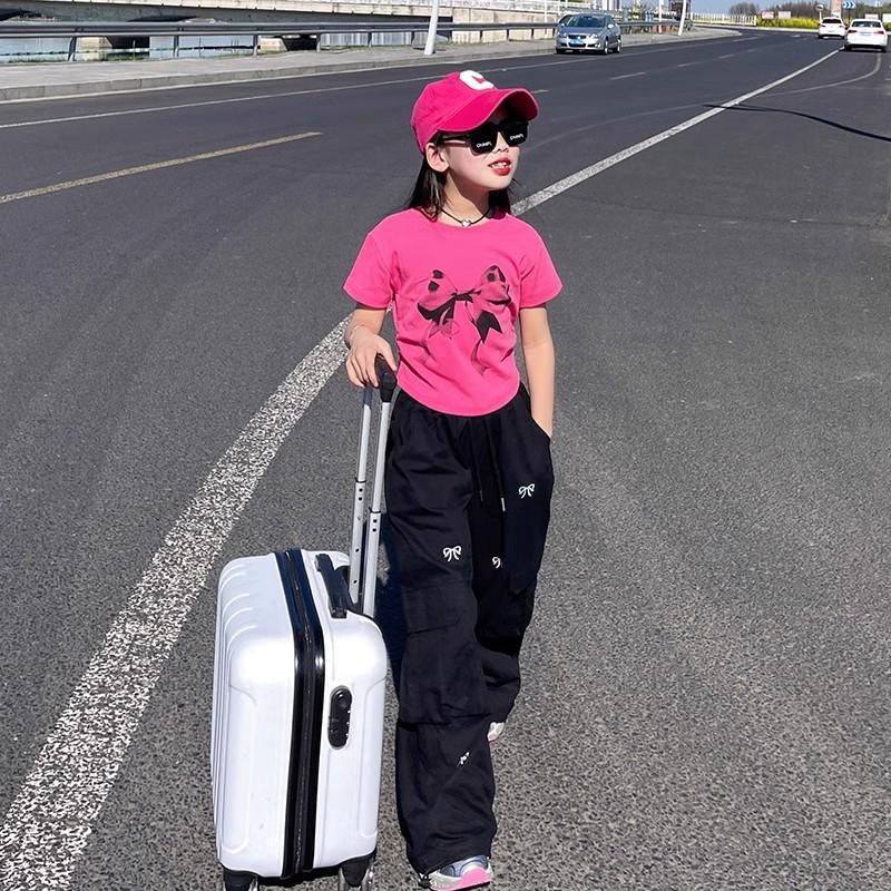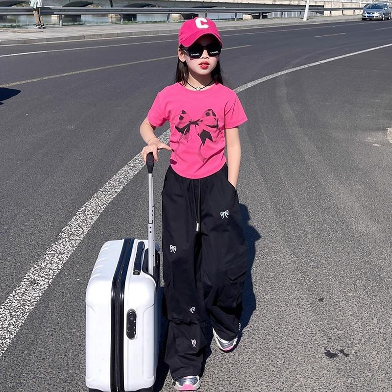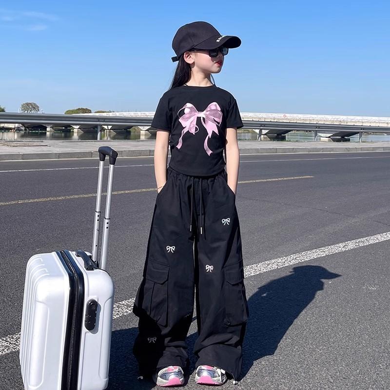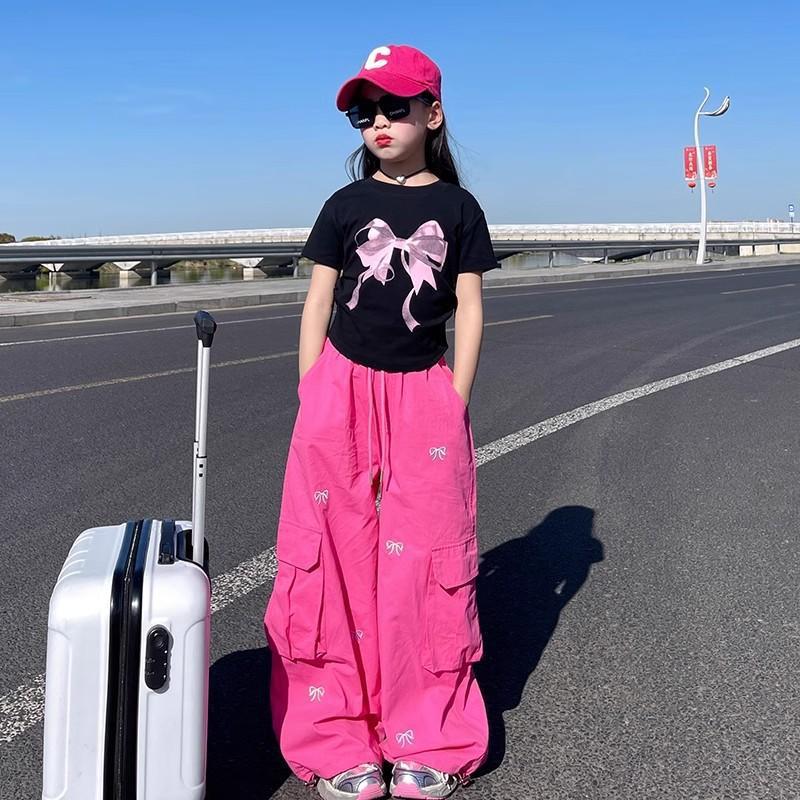 夏女童复古趣味蝴蝶结刺绣休闲长裤阔腿裤童装直筒工装裤跨境