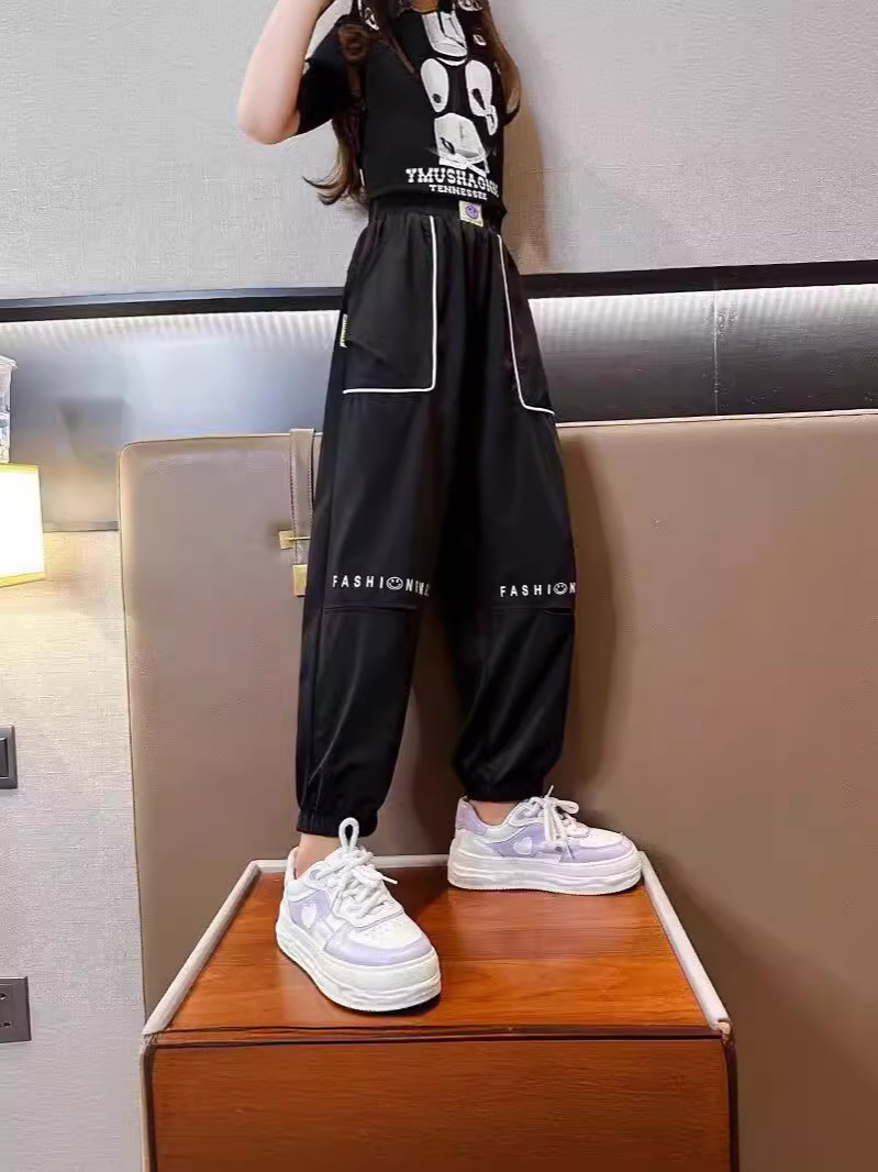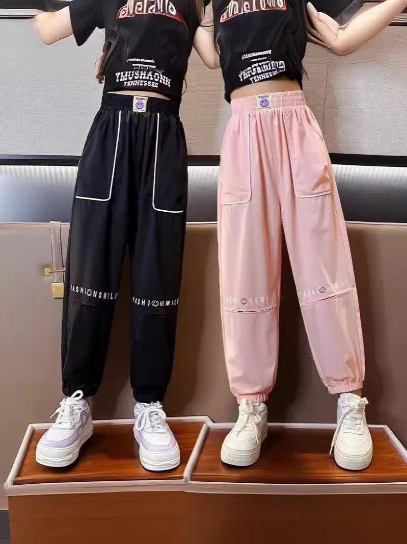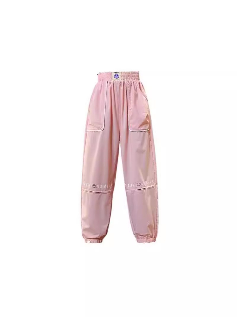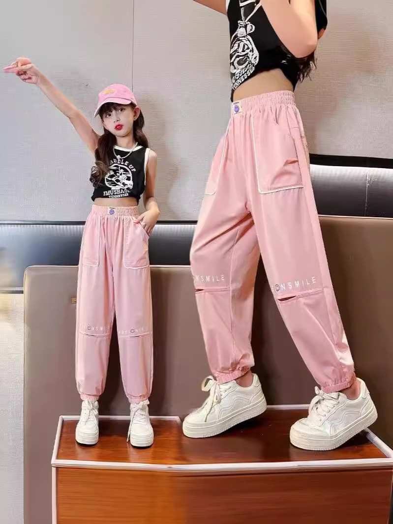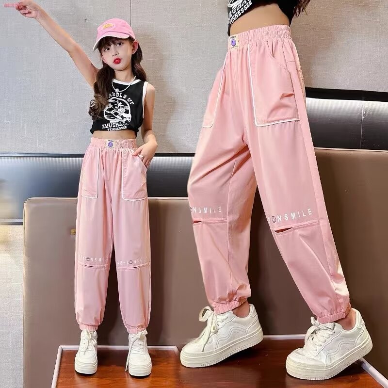 女童美式复古粉色多口袋薄款工装裤童装薄款冰丝直筒休闲防蚊裤子