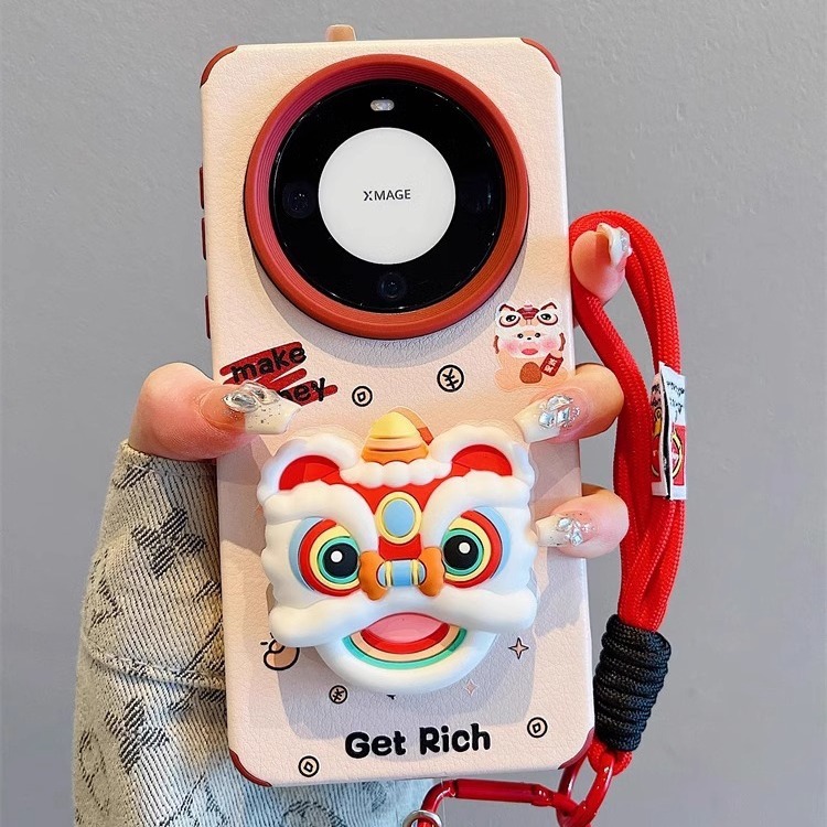 适用华为mate60pro手机壳p60立体醒舞狮支架50E皮质全包保护套40e