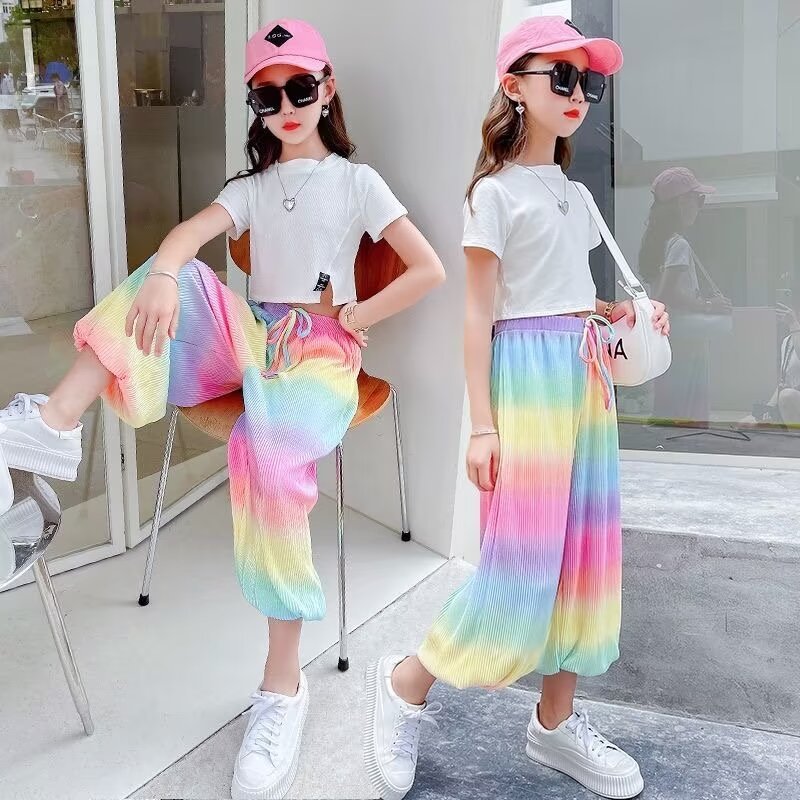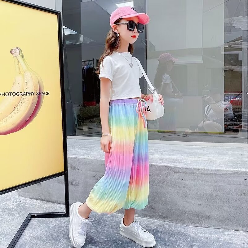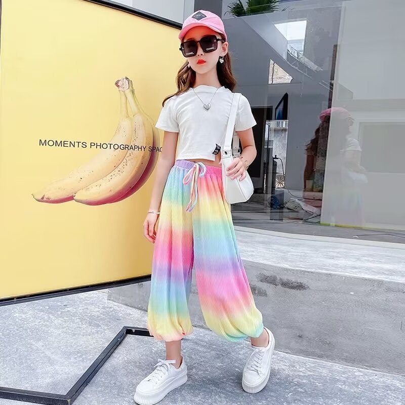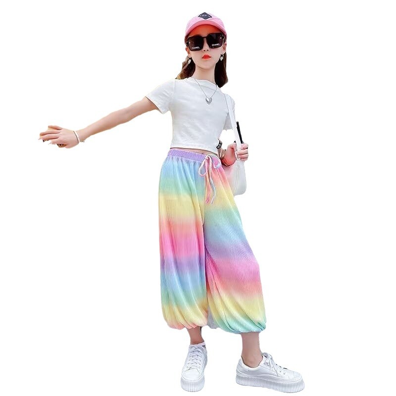 女童阔腿冰丝裤夏季网红童装休闲彩虹裤中大童潮流灯笼裤防蚊