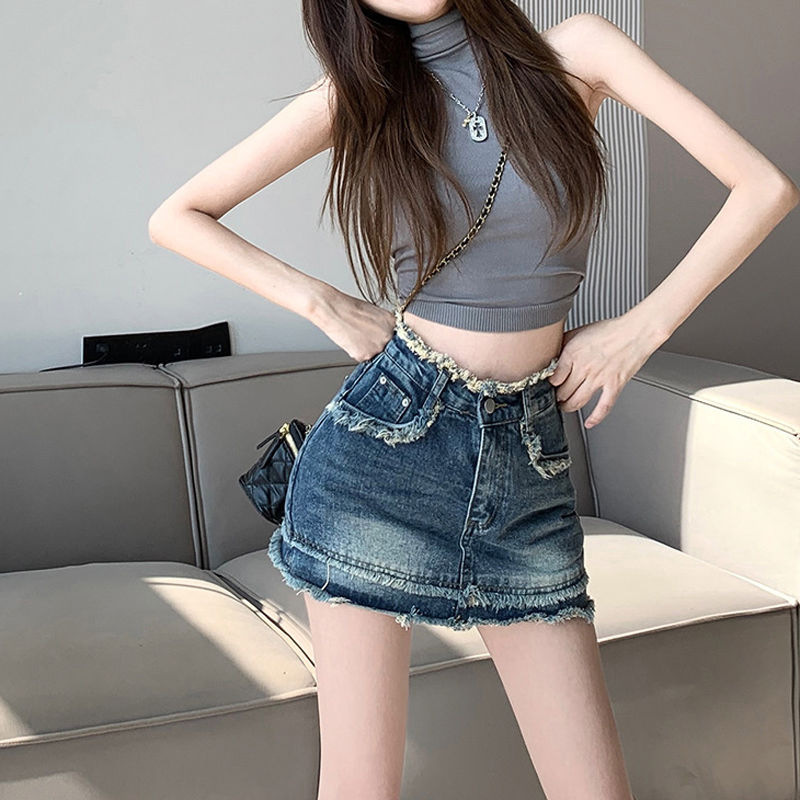 毛边内衬牛仔短裙女春夏胖mm高腰显瘦设计感A字辣妹包臀裙半身裙