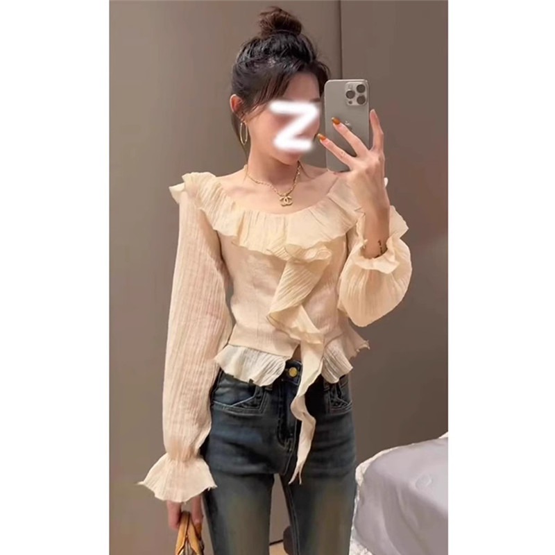 法式荷叶边一字肩长袖衬衫女早秋设计感独特别致漂亮小衫长袖上衣