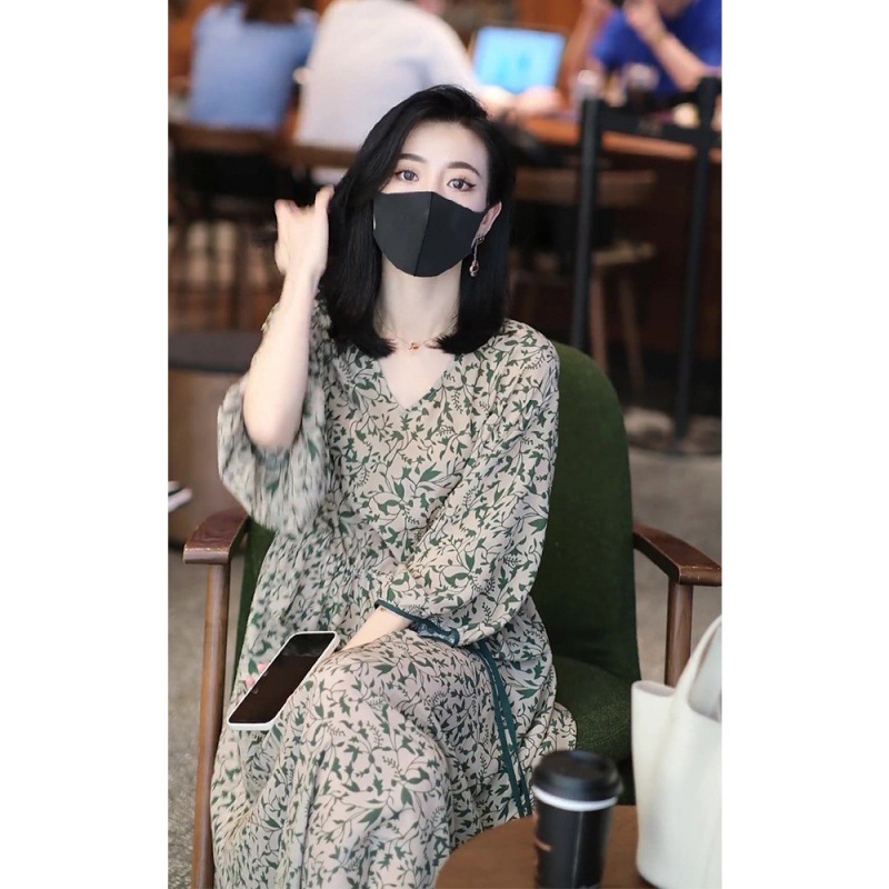 春夏季新款法式温柔风宽松长裙女气质泡泡袖V领碎花连衣裙