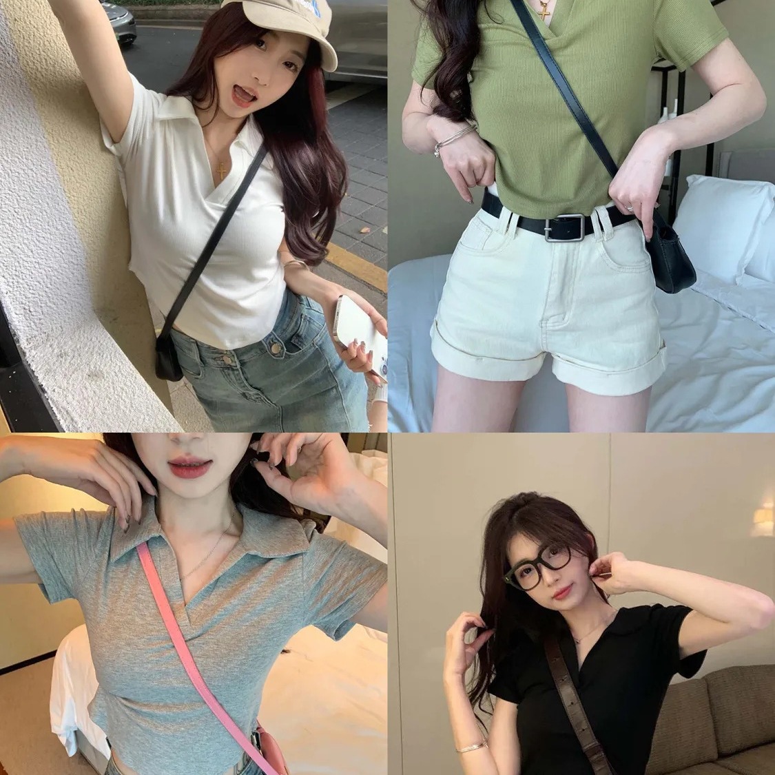 不规则V领正肩短袖女夏季新款百搭辣妹修身显瘦Polo衫T恤上衣
