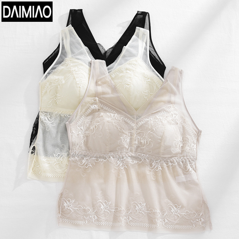 春新款法式蕾丝内衣女士固定一体杯美背吊带胸垫背心内搭打底裹胸