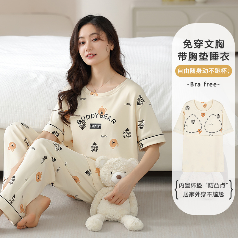 带胸垫睡衣女夏季纯棉短袖长裤外穿简约休闲家居服新款套装
