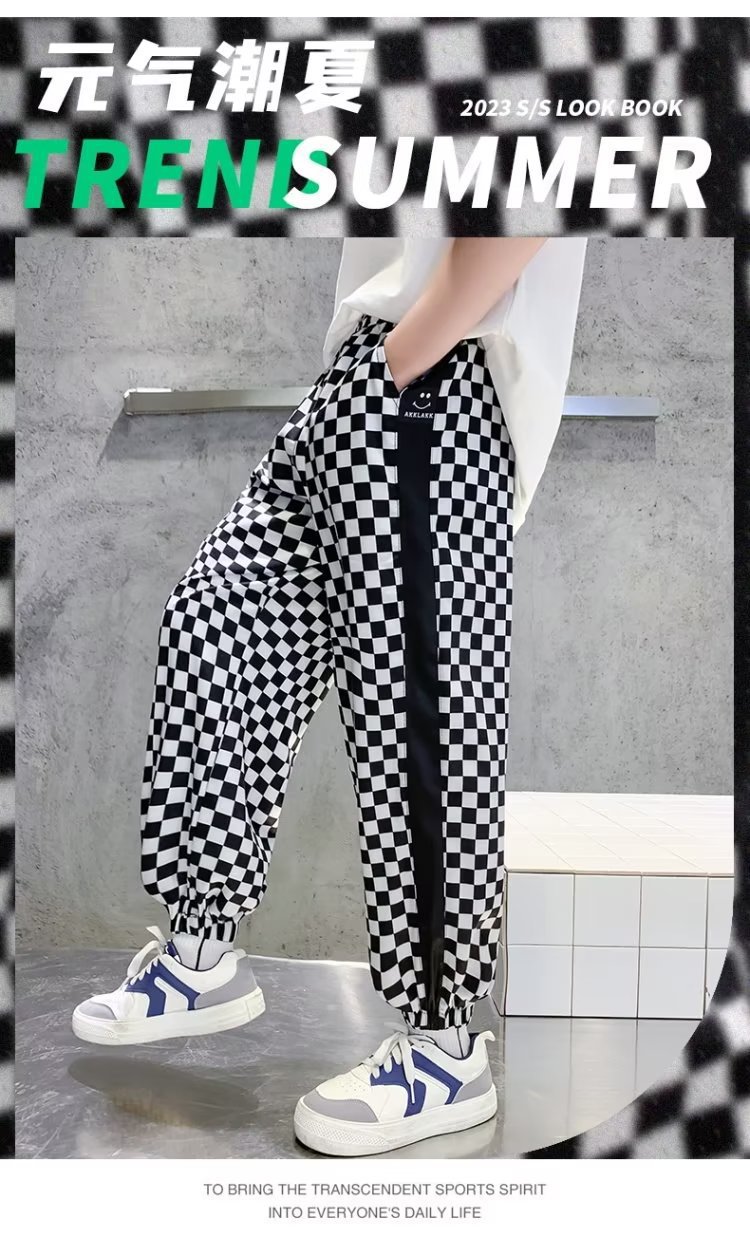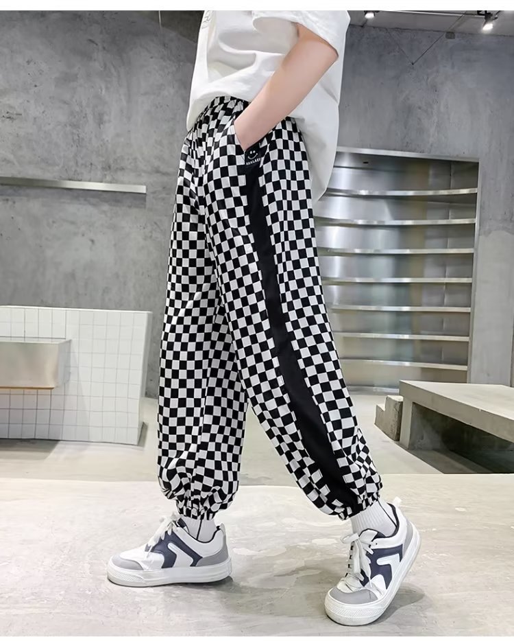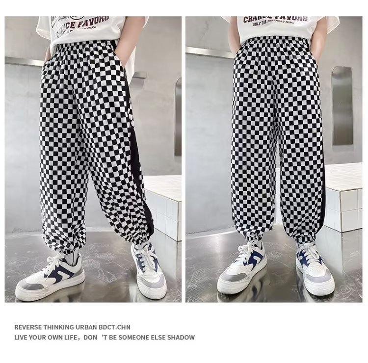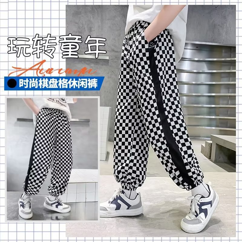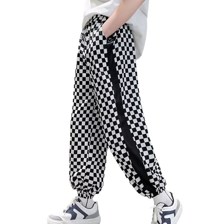 男童裤子夏季儿童冰丝防蚊裤棋盘格女童炸街运动速干休闲长裤
