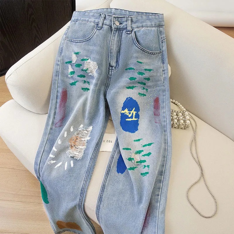 2025春秋新款涂鸦印花显瘦垂感直筒牛仔裤女高腰宽松显瘦阔腿裤子