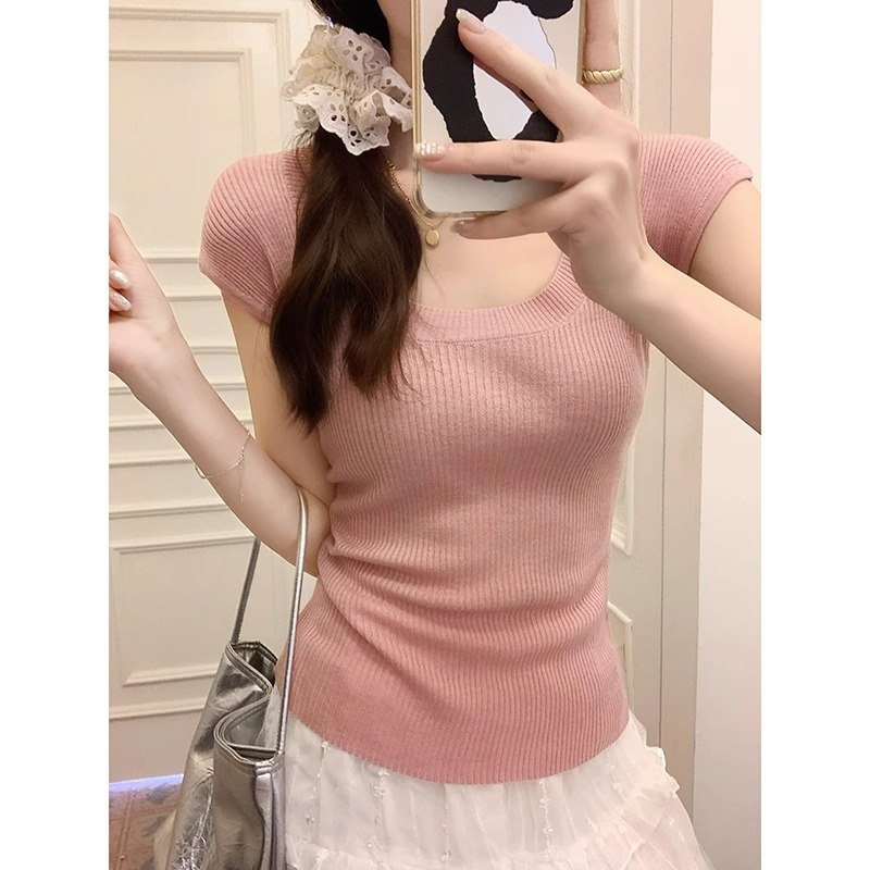 粉色低U领夏季正肩短袖针织T恤女修身低纯欲甜辣妹短款小飞袖上衣