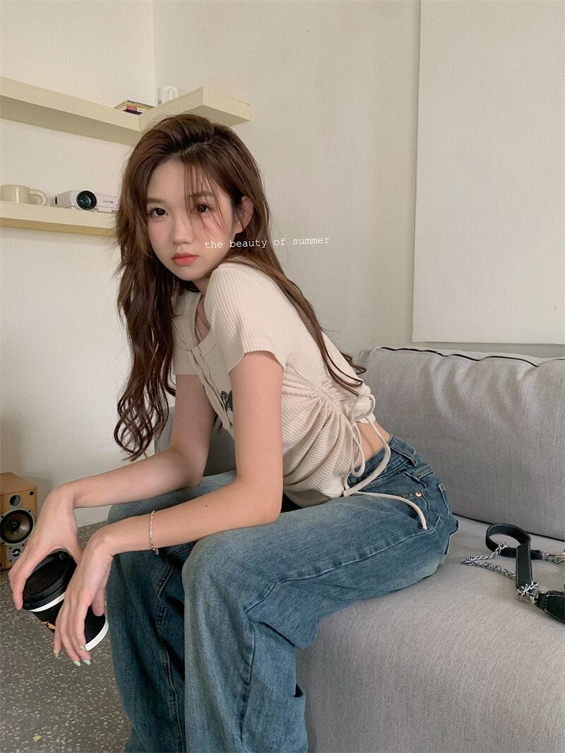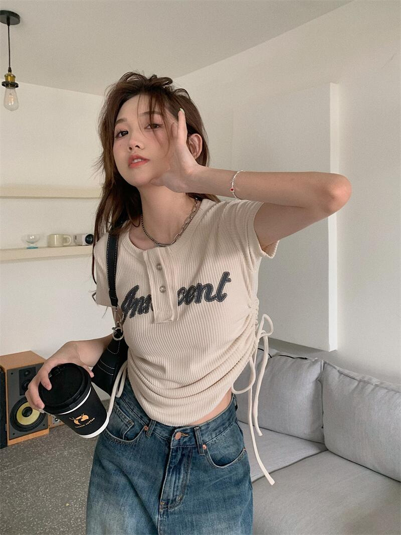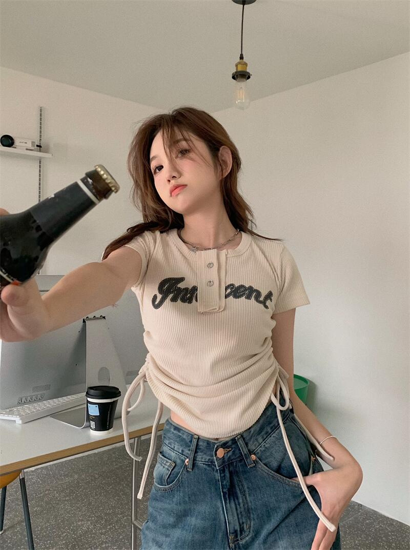 女生T恤辣妹正肩短袖t恤女夏季女装衣服抽绳显瘦字母针织上衣潮