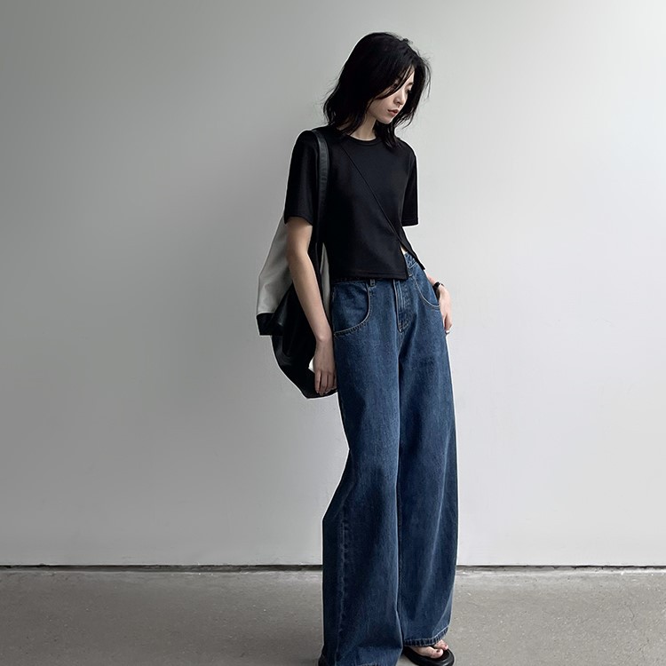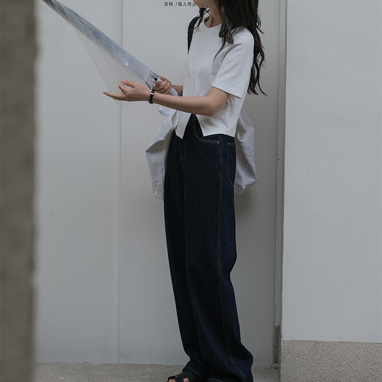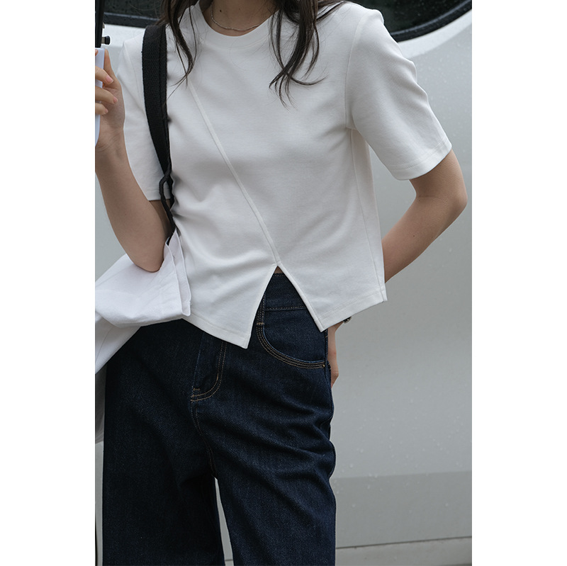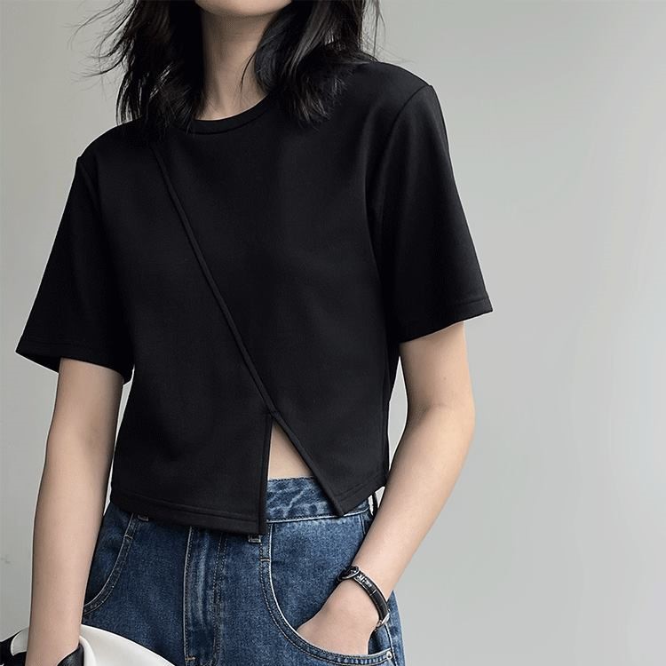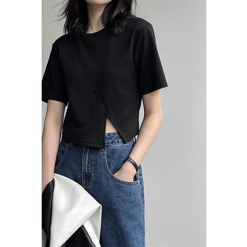 春夏新款个性分割线正肩设计感白色黑色短袖上衣短款T恤女