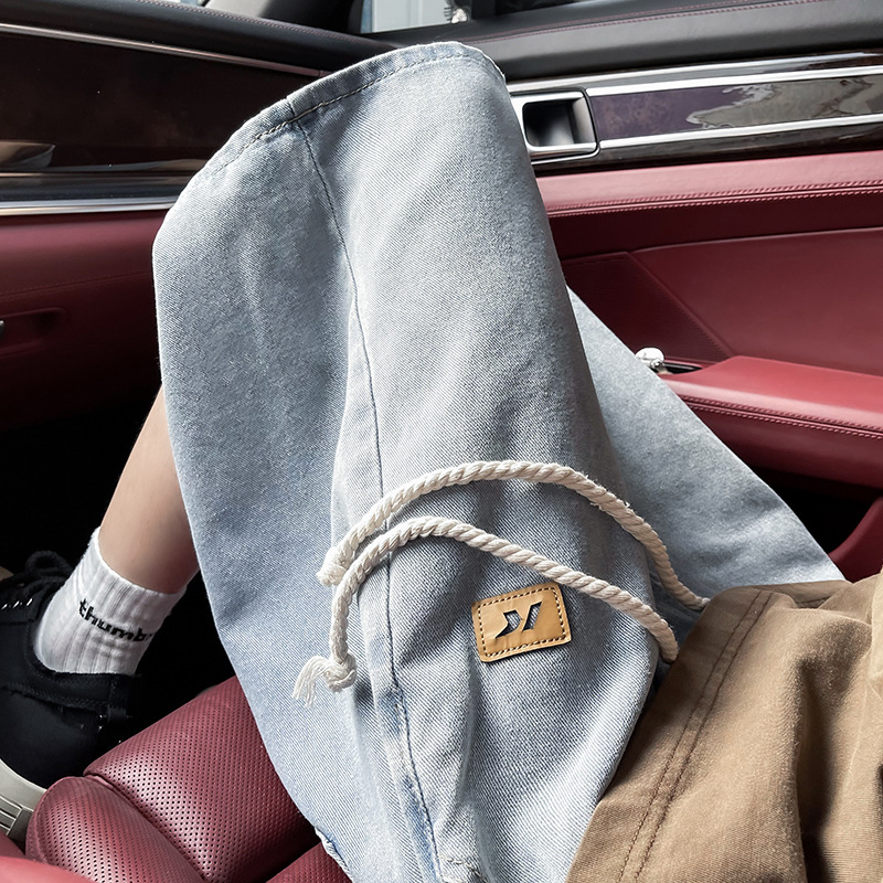 美式高街工装牛仔短裤男夏季宽松抽绳百搭做旧直筒阔腿休闲五分裤