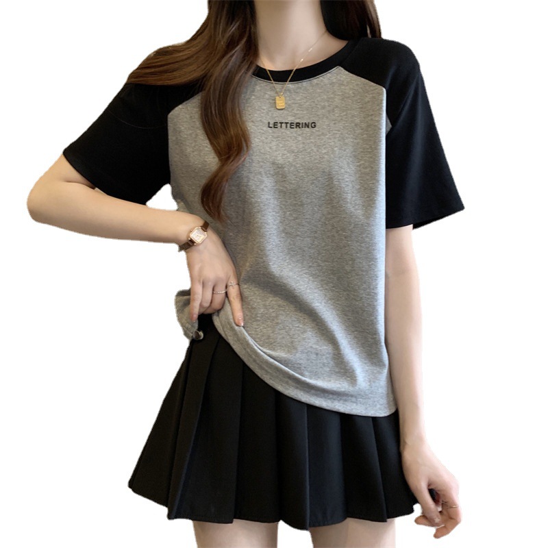 短袖T恤女夏季刺绣字母打底衫大码显瘦休闲正肩撞色抽绳上衣外穿