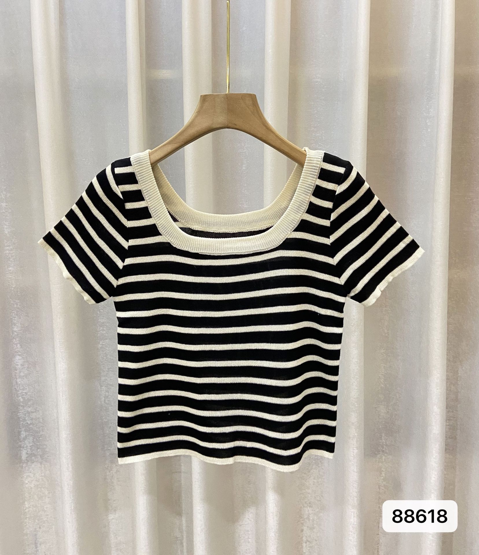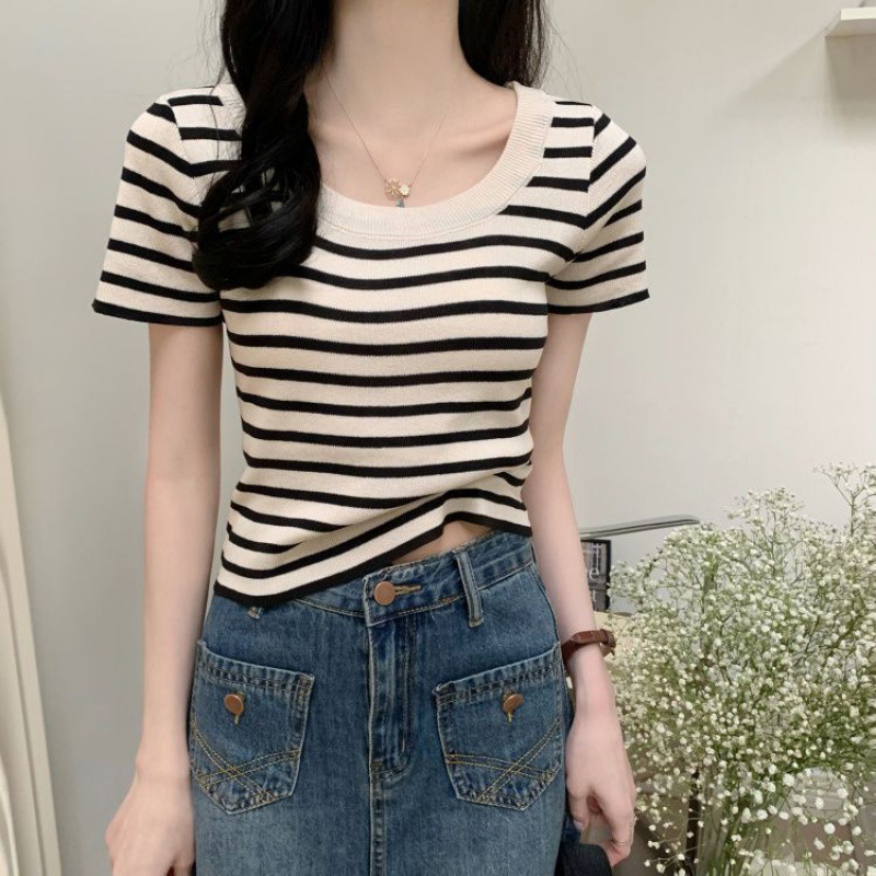 日系休闲短袖正肩修身条纹T恤女夏季新款撞色港味短款套头上衣潮