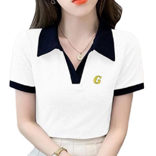 夏季新款字母绣花撞色polo领短袖t恤女正肩翻领休闲上衣ins潮