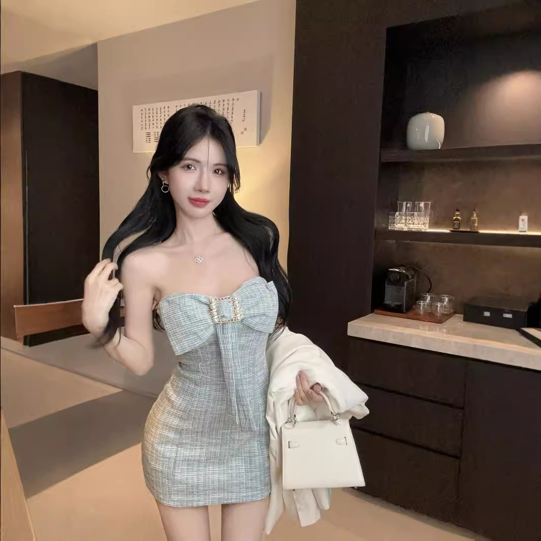 优雅气质设计感蝴蝶结装饰辣妹纯欲性感抹胸显瘦收腰连衣裙短裙女