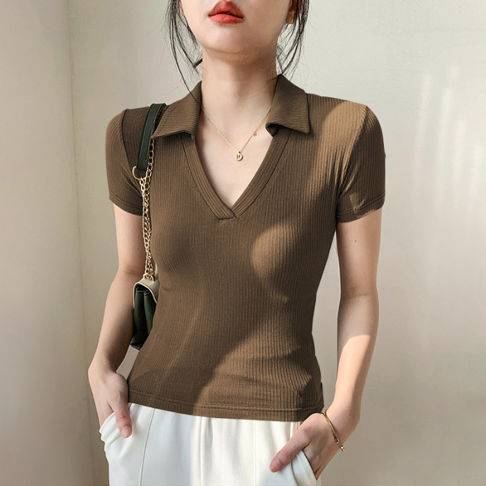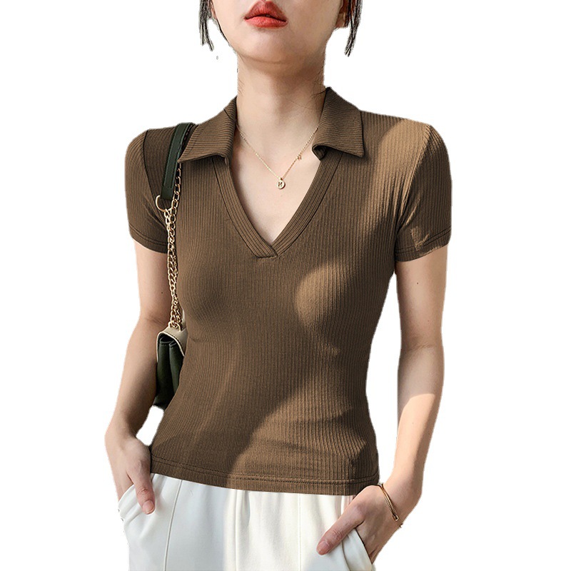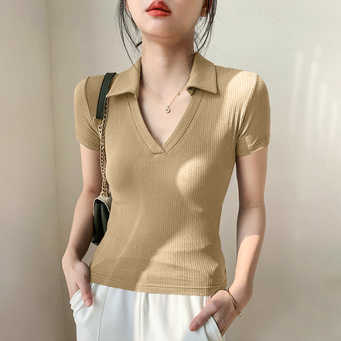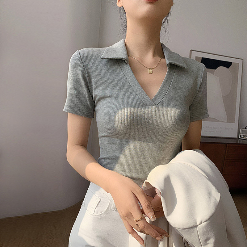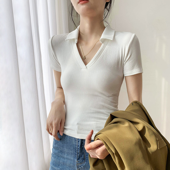设计感polo衫短袖t恤女夏季新款修身正肩v领纯欲辣妹短款上衣