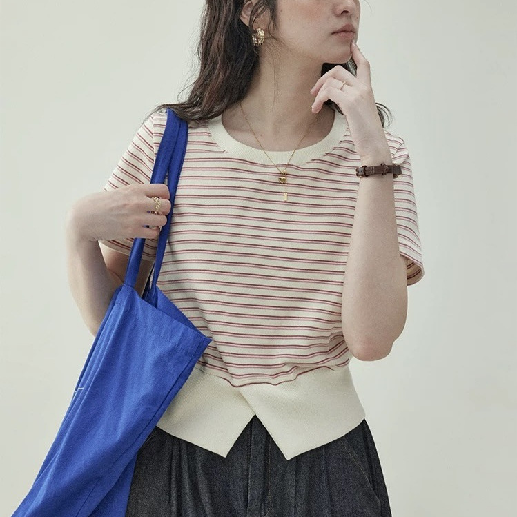 「北岛」甜美红条纹收腰短款t恤女夏季新款开叉短袖上衣