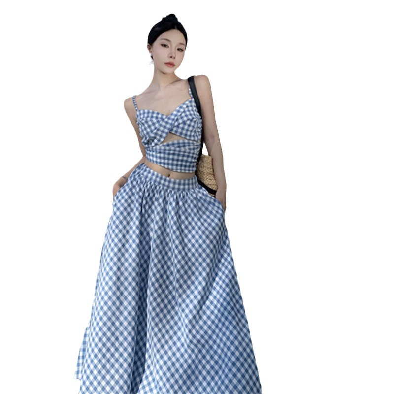 夏季新款蓝白格子蝴蝶结系带露背吊带背心+高腰半身裙套装两件套
