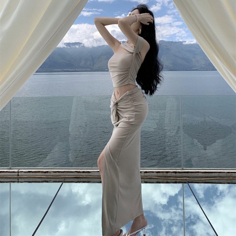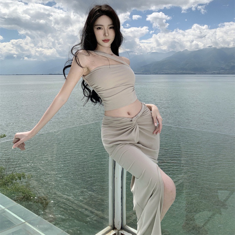 辣妹风套装裙气质女神范夏新款性感挂脖抹胸+开叉半身裙两件套女