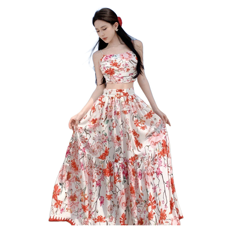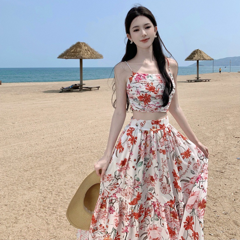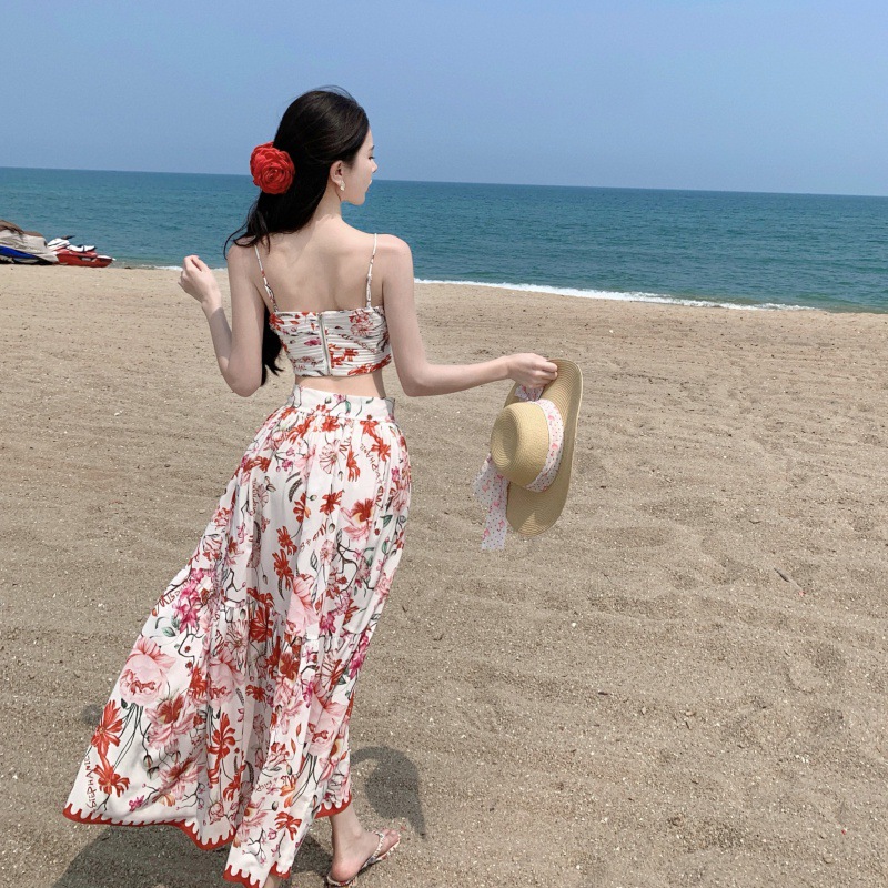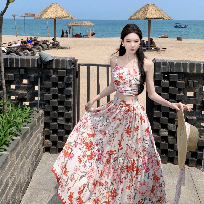 热带海岛夏新款法式吊带上衣+印花半身裙海边度假套装两件套