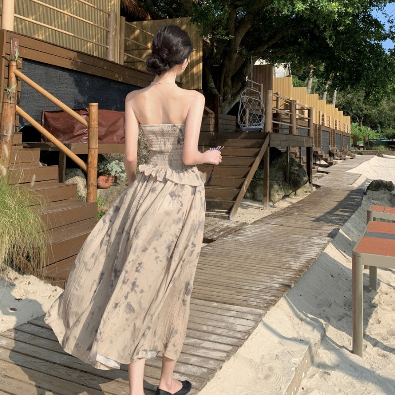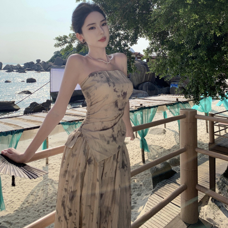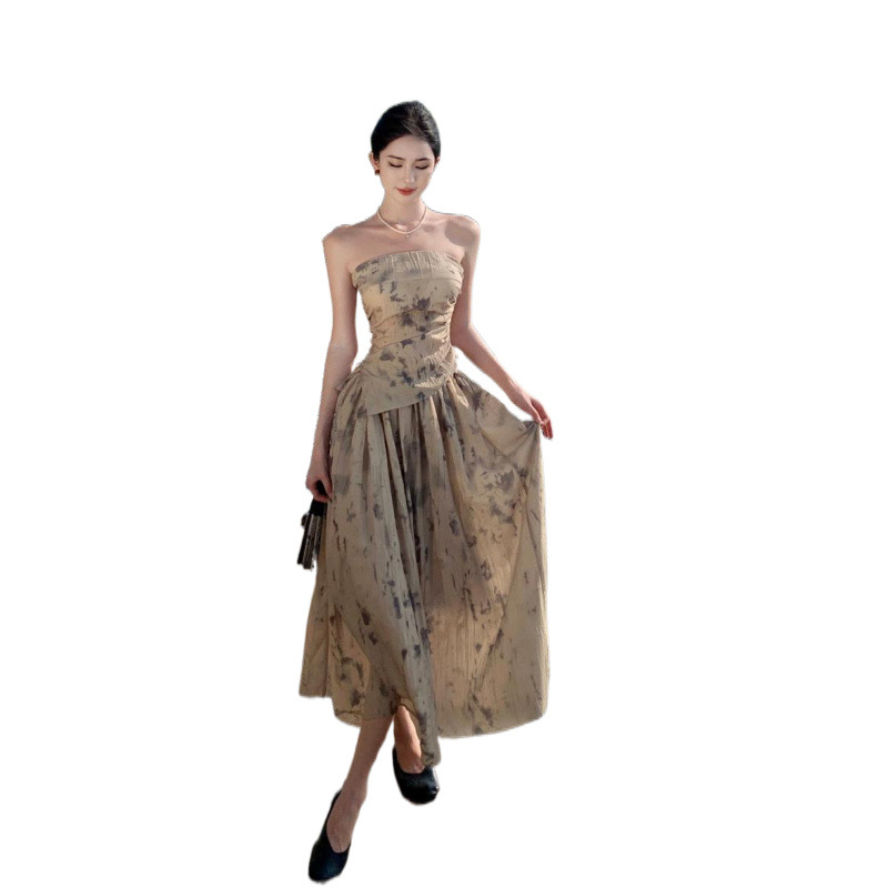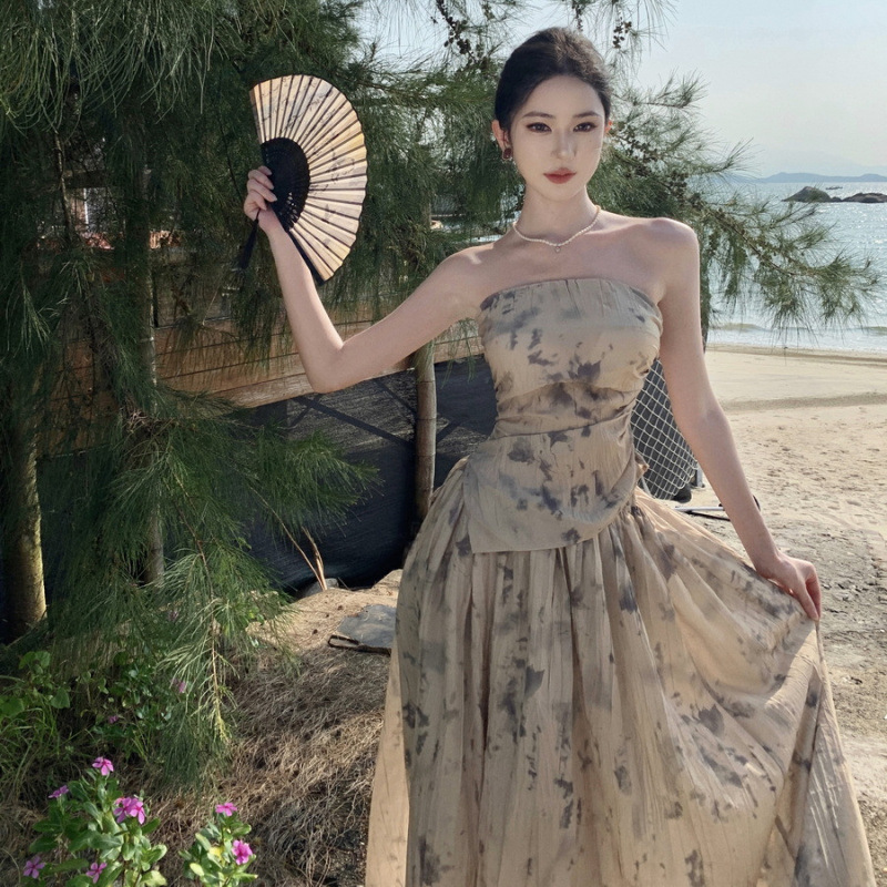 实拍水墨印花抹胸上衣+半身裙套装显瘦收腰套装裙简约气质超修身