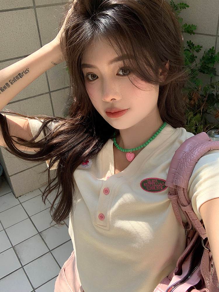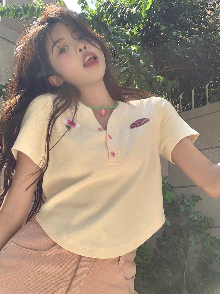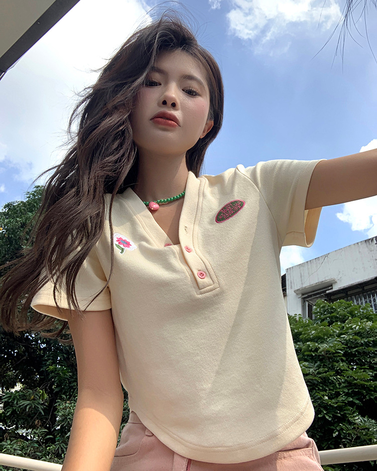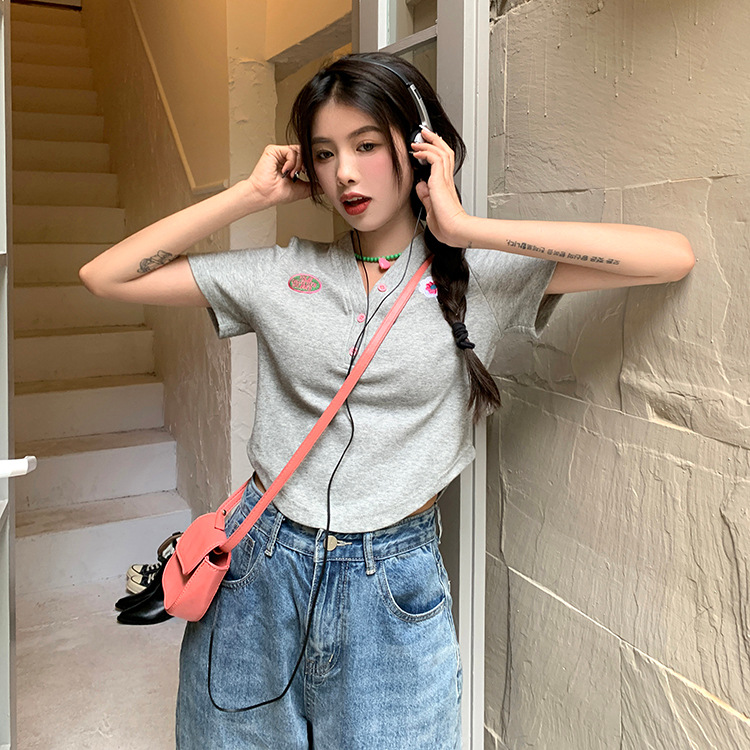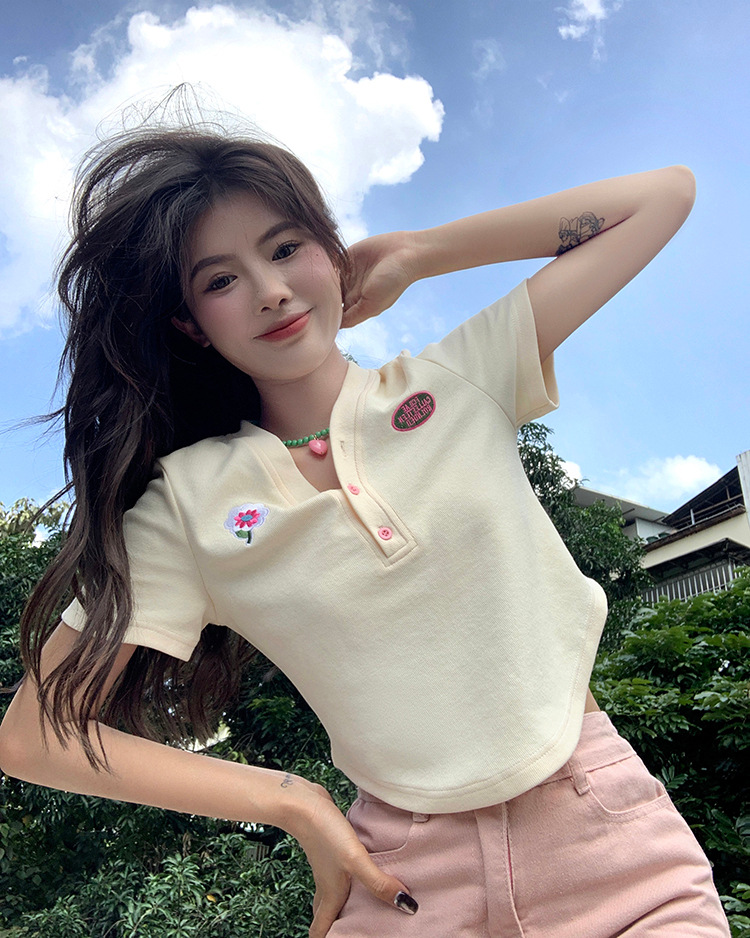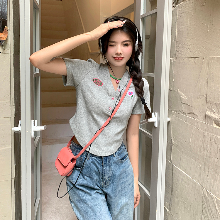 修身正肩短袖T恤女设计感V领刺绣夏季清新甜美短款小众别致上衣潮