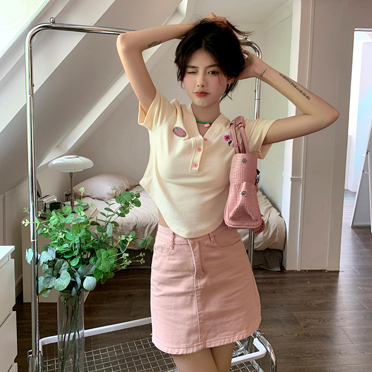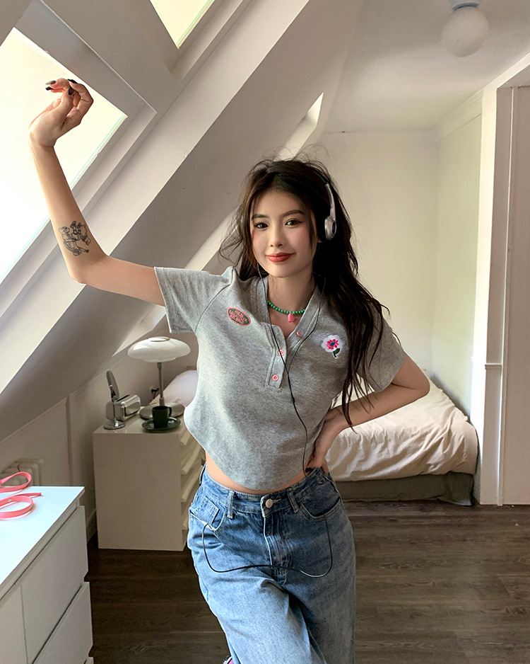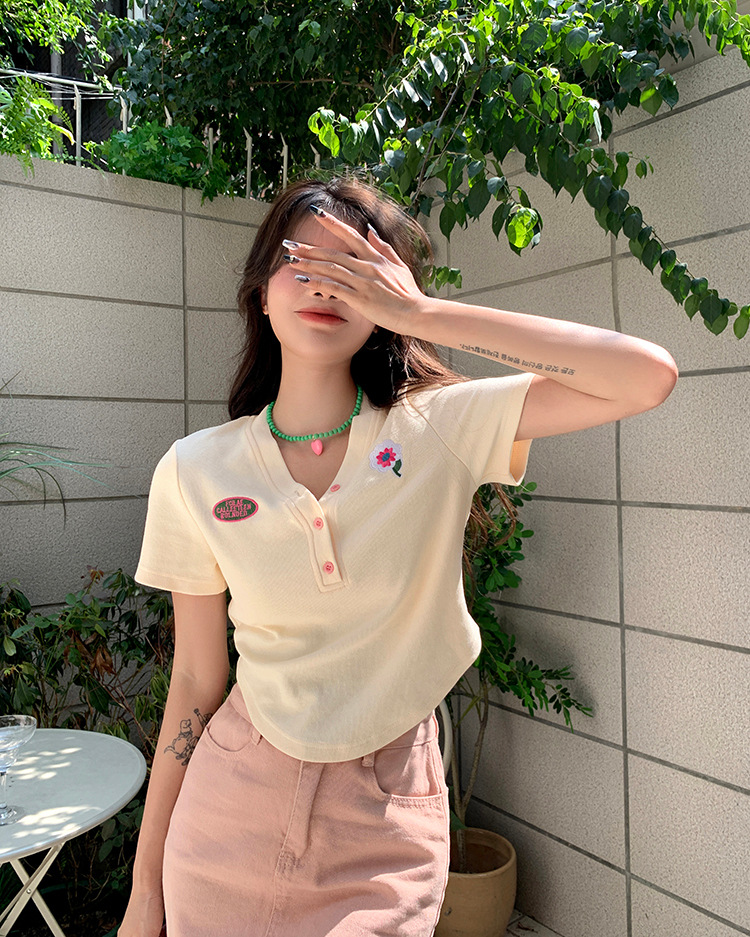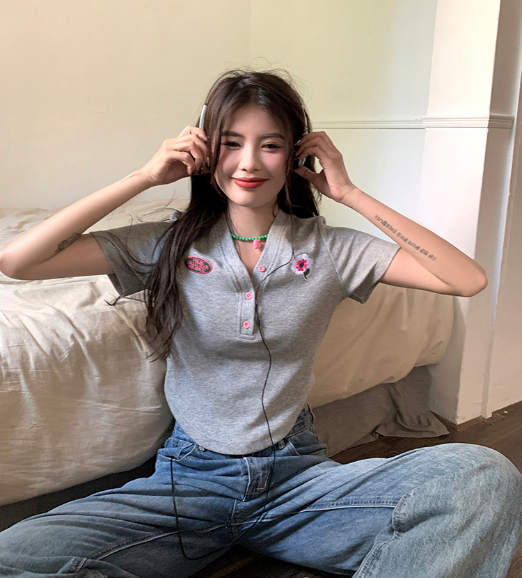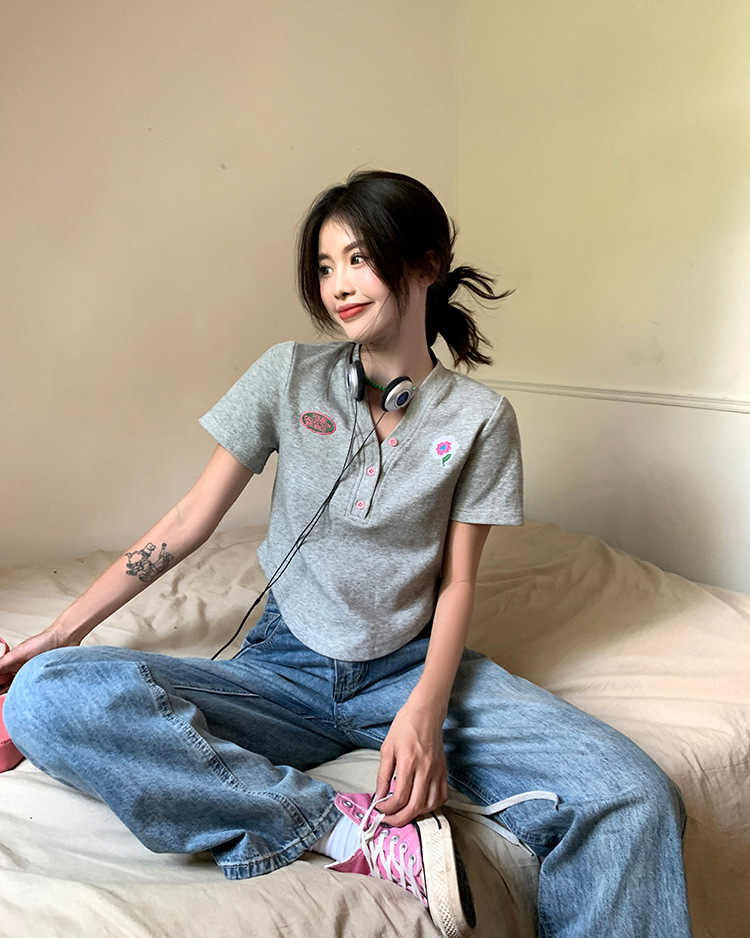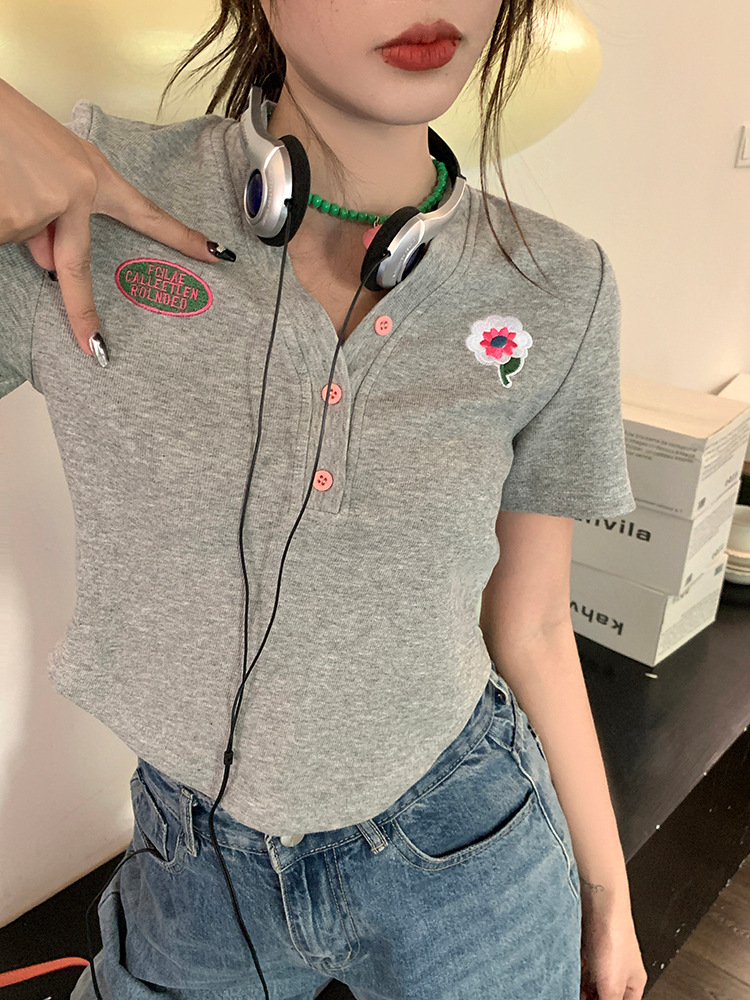 修身正肩短袖T恤女设计感V领刺绣夏季清新甜美短款小众别致上衣潮