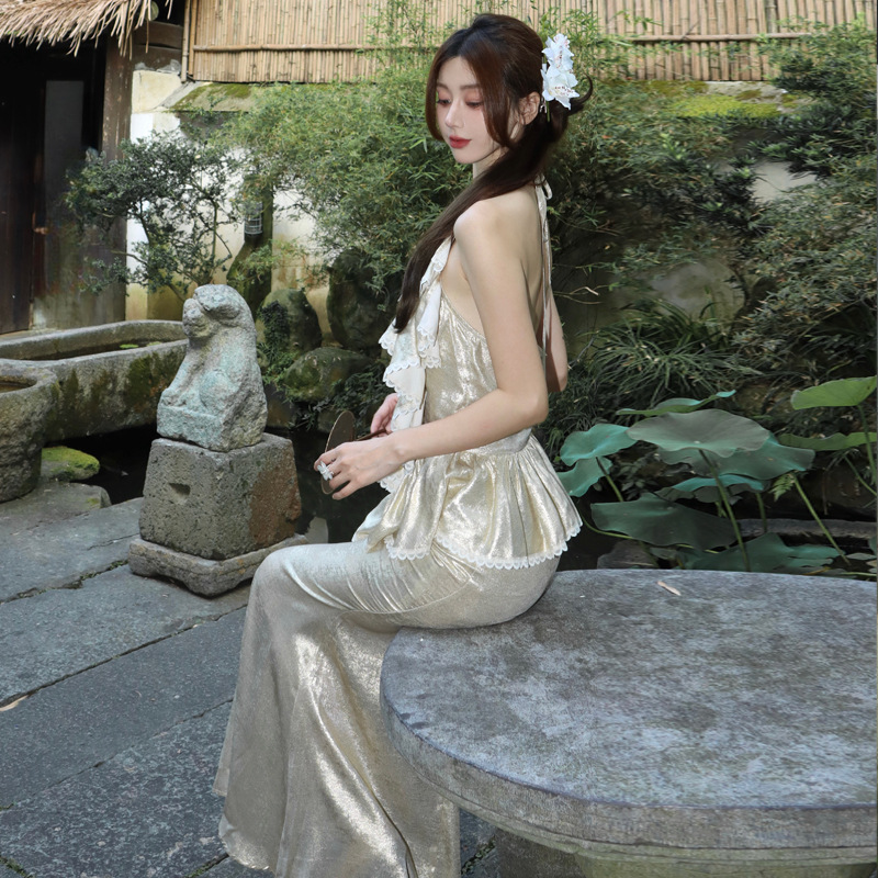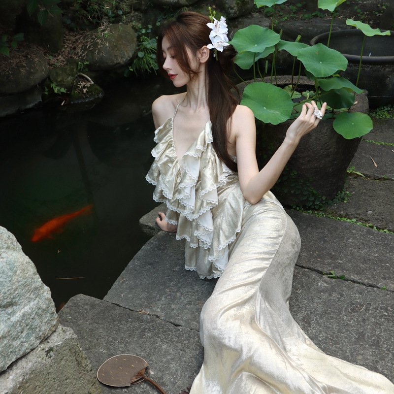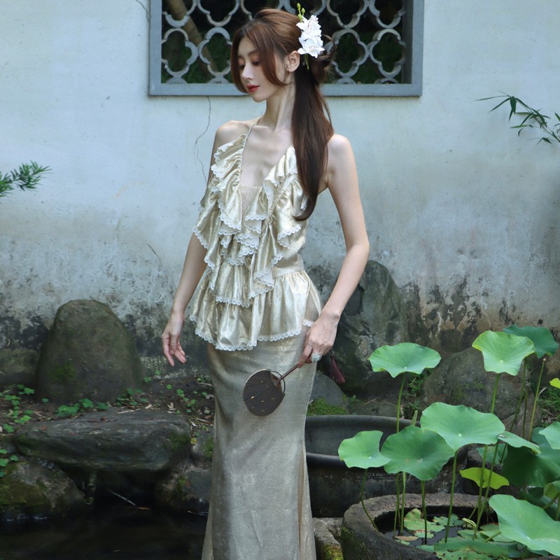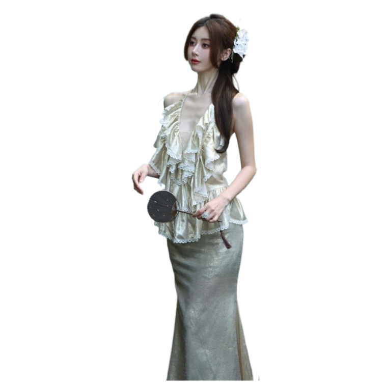 旅游度假风蕾丝多层花边吊带上衣+金属半身裙套装两件套