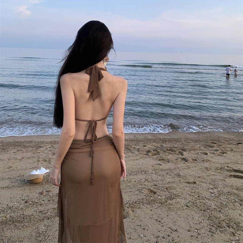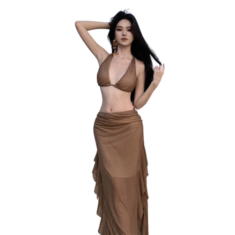 夏新款海边度假高级感挂脖抹胸+遮肚显瘦荷叶边半身裙两件套套装
