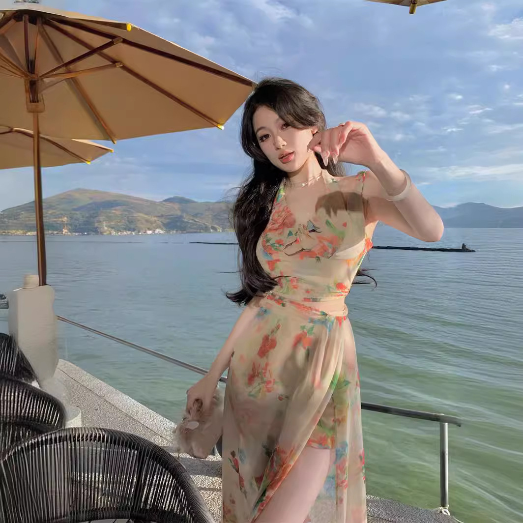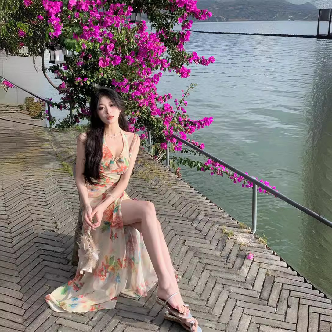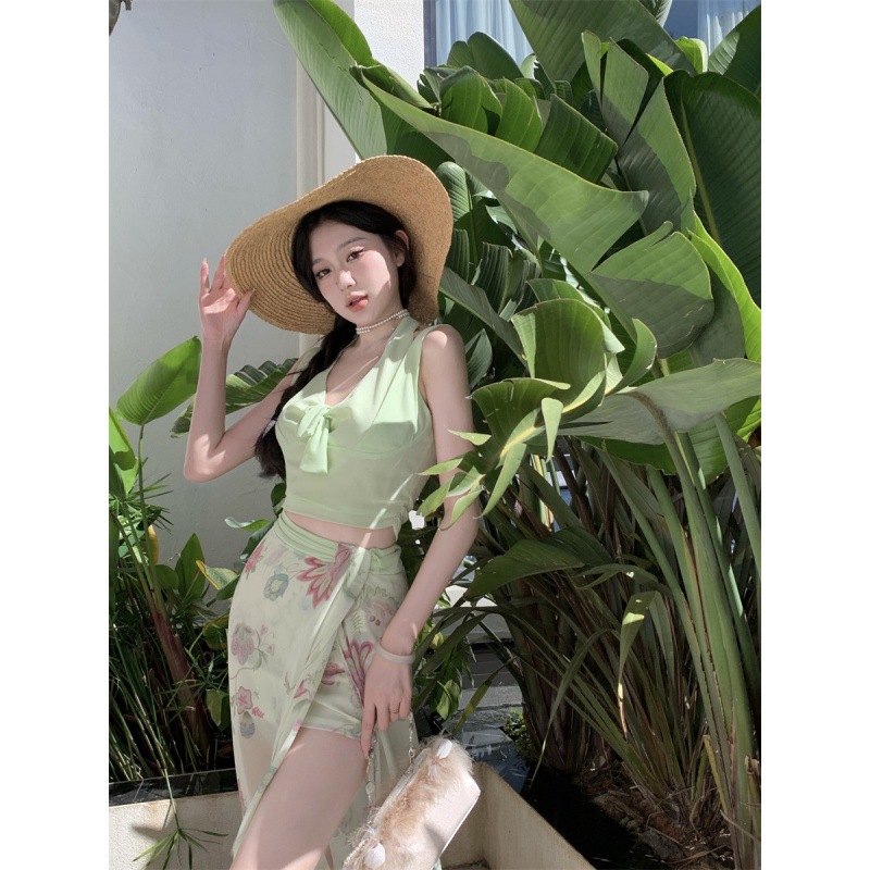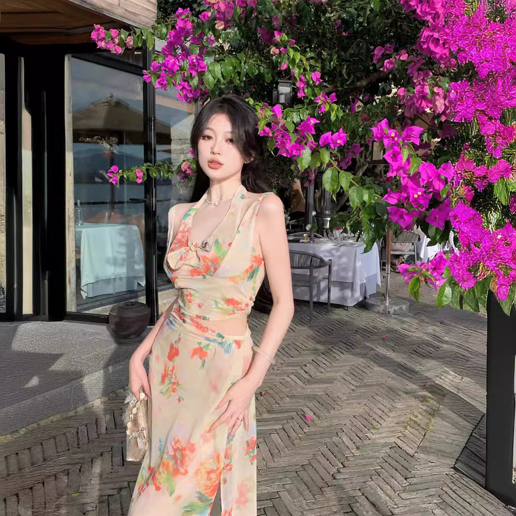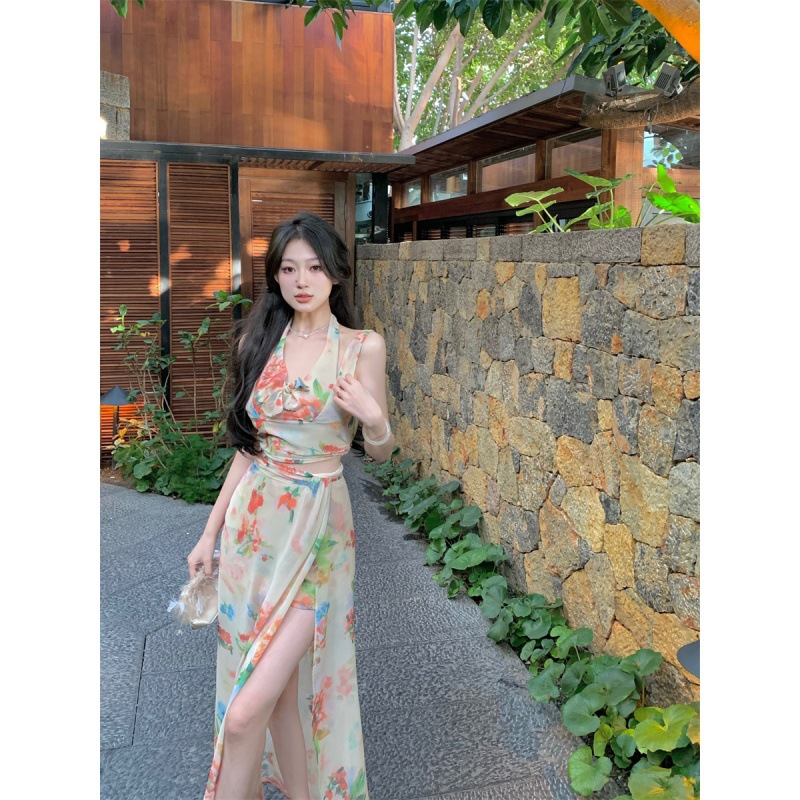 昭花仙杏碎花挂脖显瘦仙仙吊带高腰开叉半身裙套装靓丽青春两件套