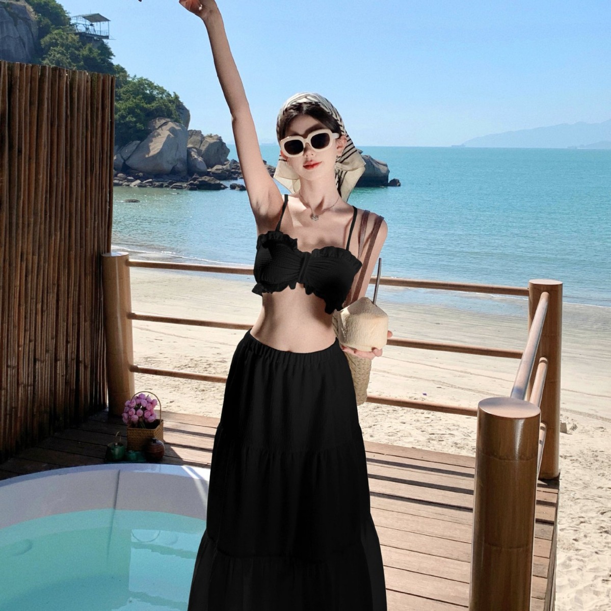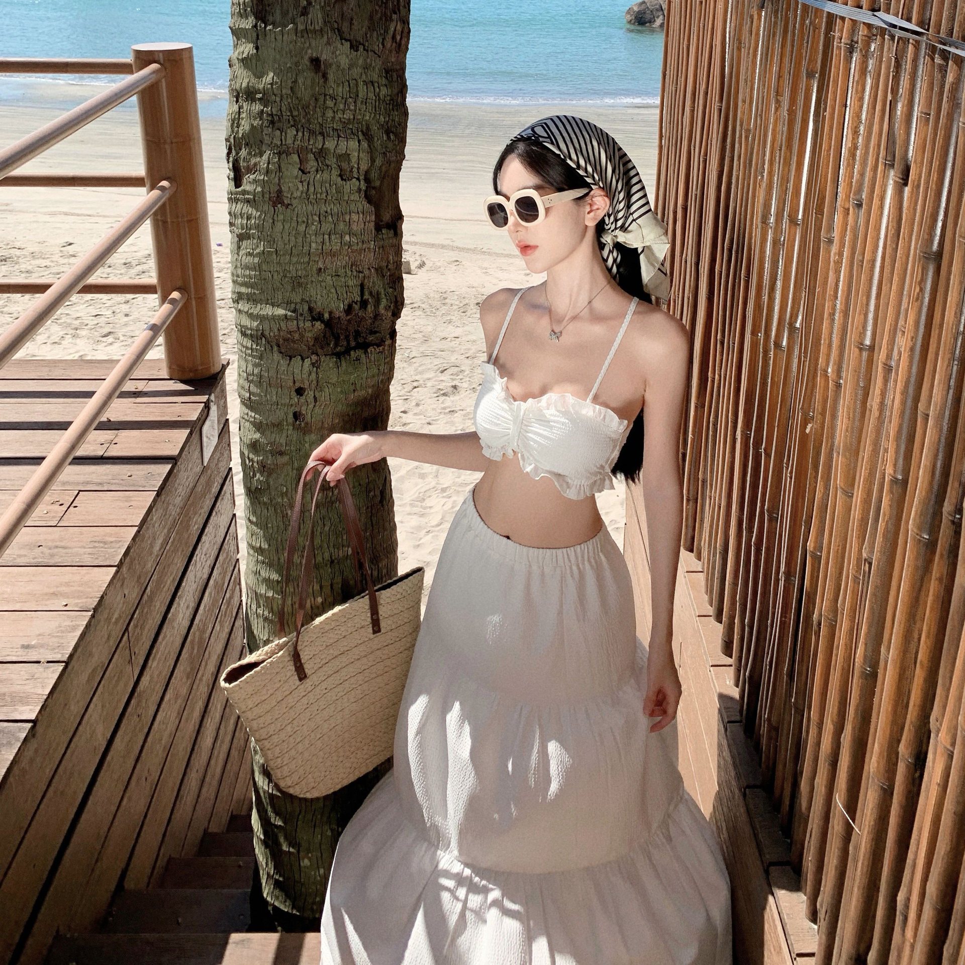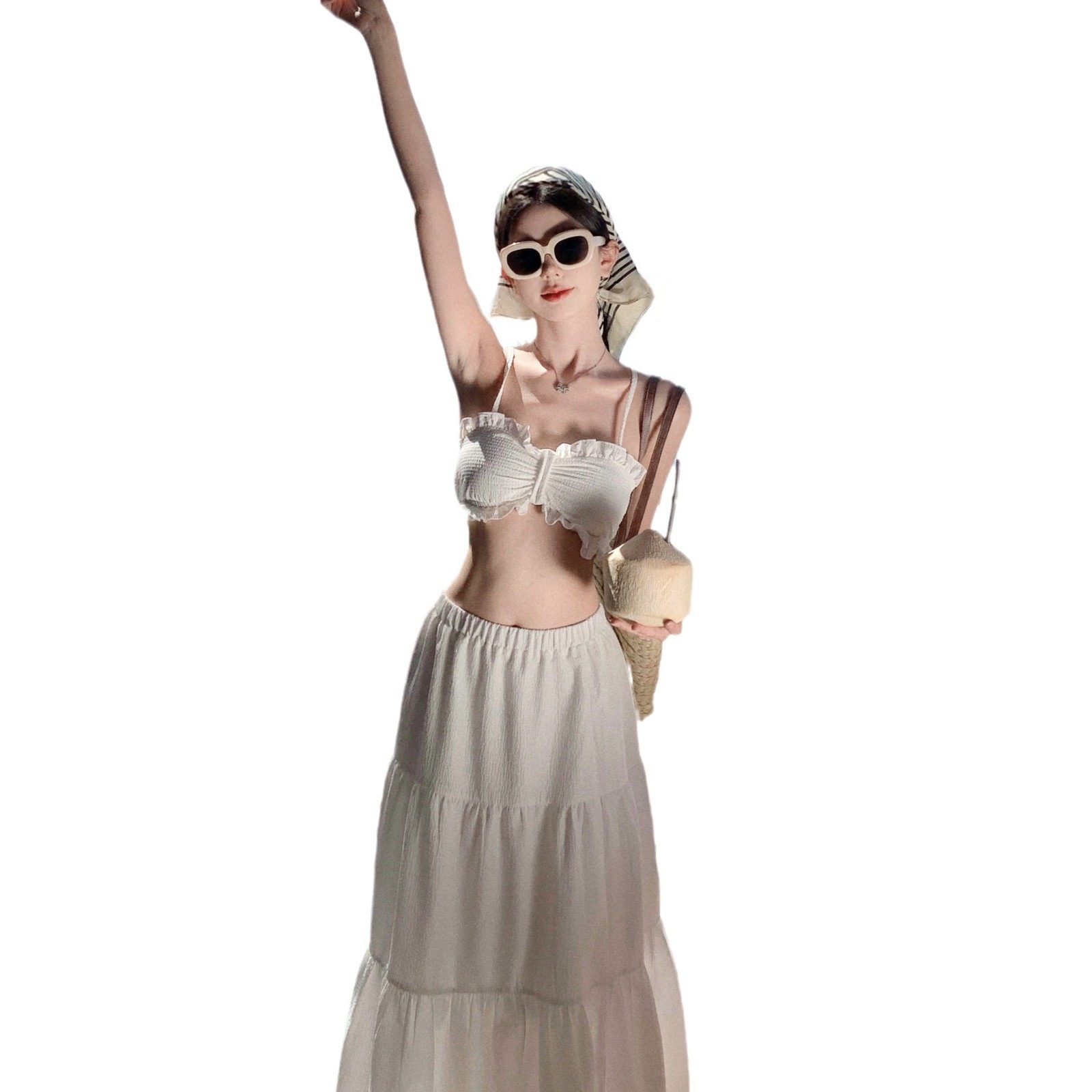 白色短款带胸垫吊带背心+高腰蛋糕裙半身裙两件套度假穿搭套装女