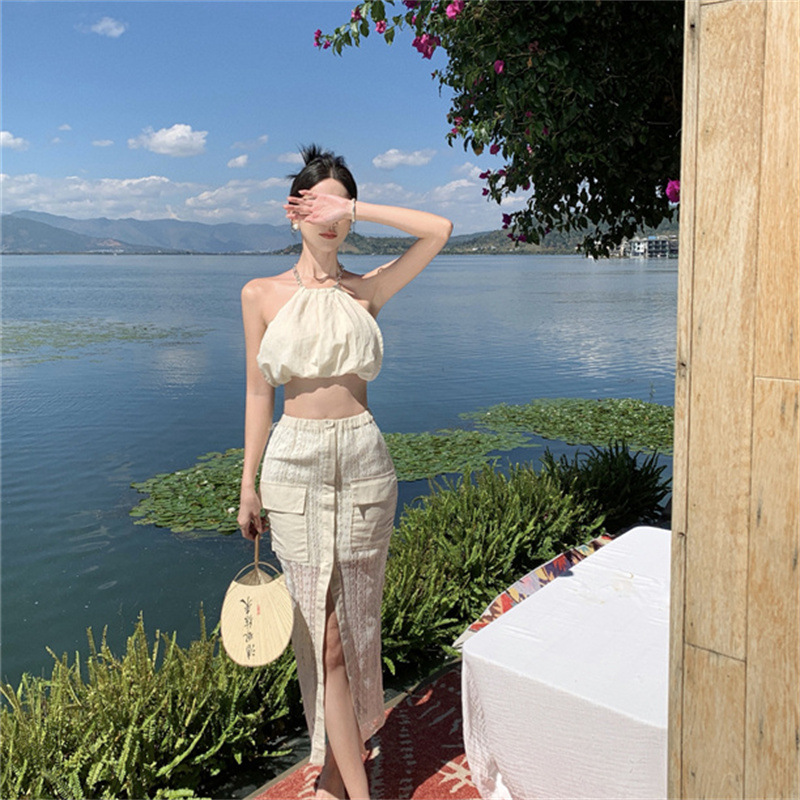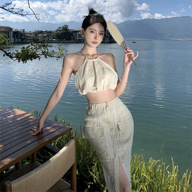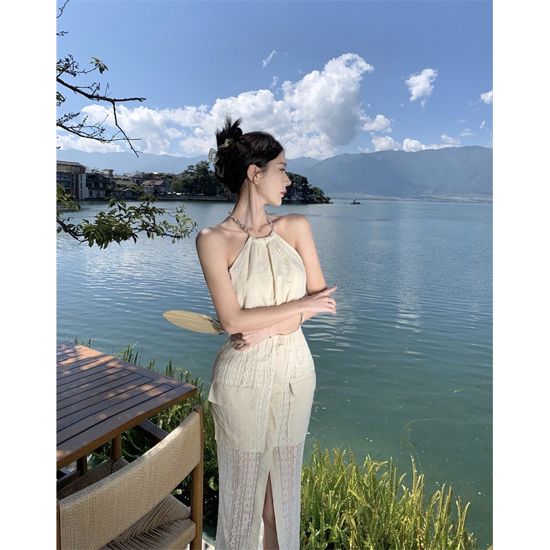 超仙新中式辣妹套装性感纯欲夏季女三亚旅游海边度假挂脖式连衣裙
