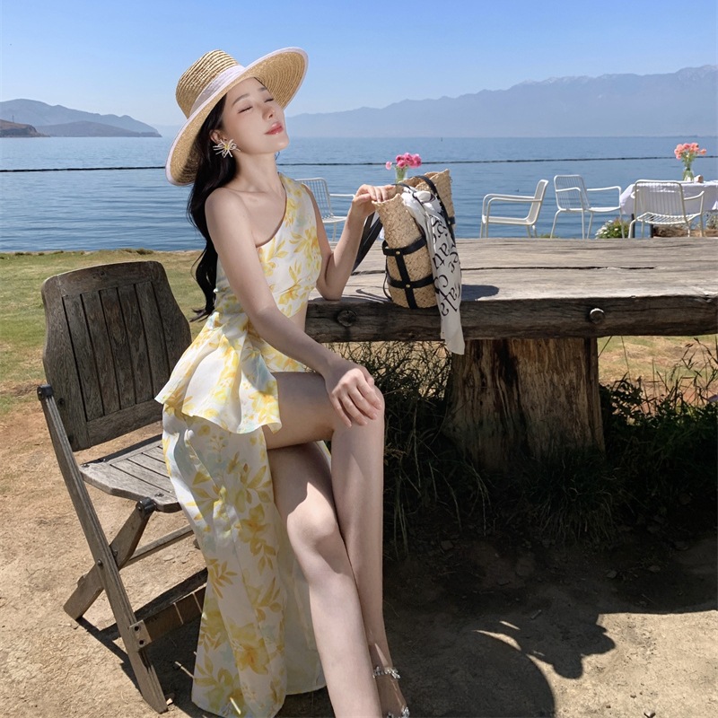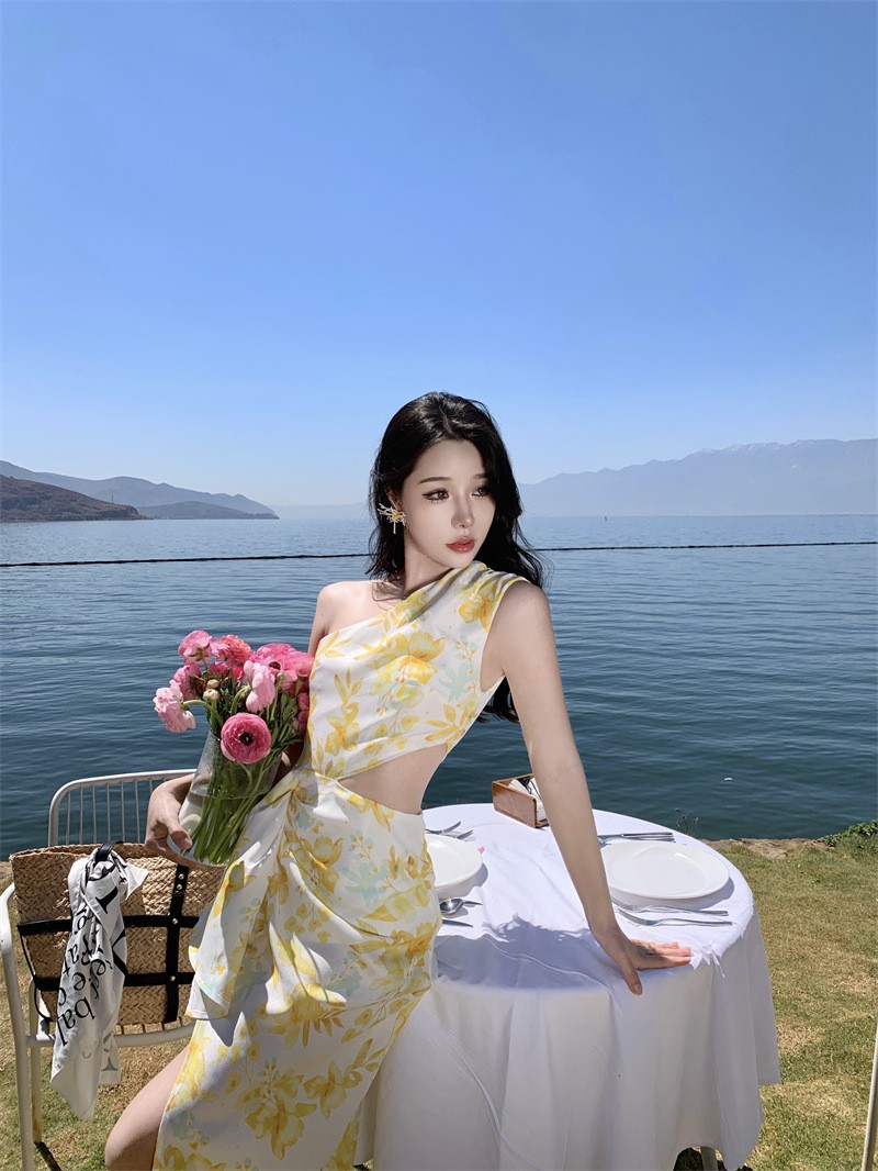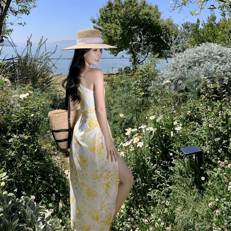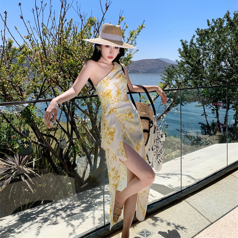 泰国海边旅游度假沙滩裙女夏碎花露腰斜肩连衣裙开叉修身包臀长裙