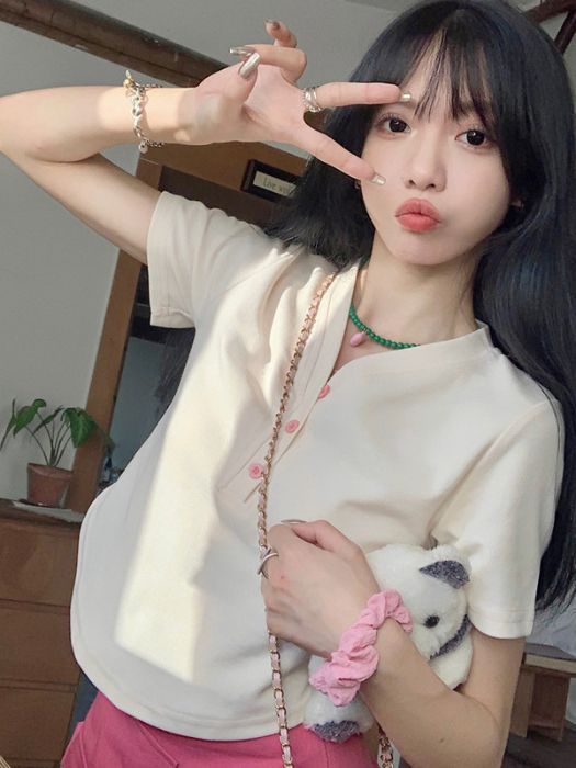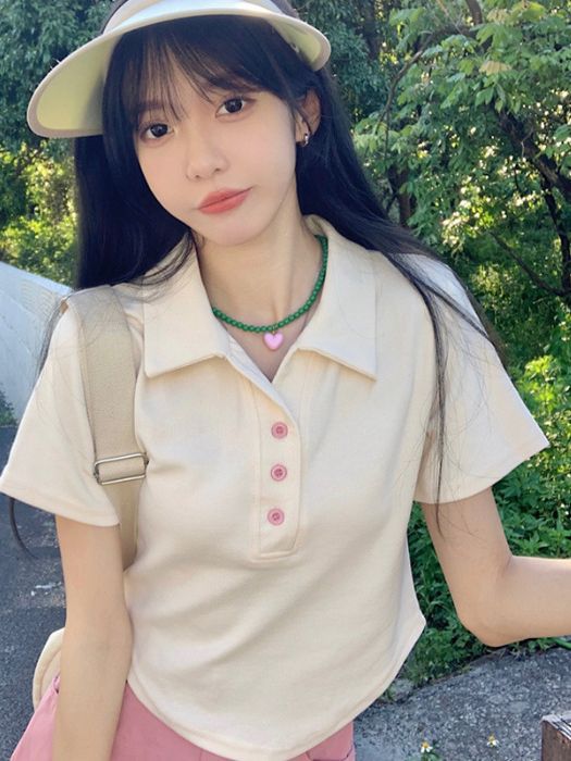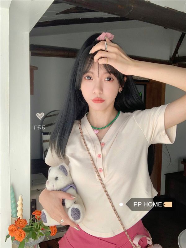 跨境 日系正肩小polo衫短袖t恤女夏季宽松纯欲设计感小众上衣